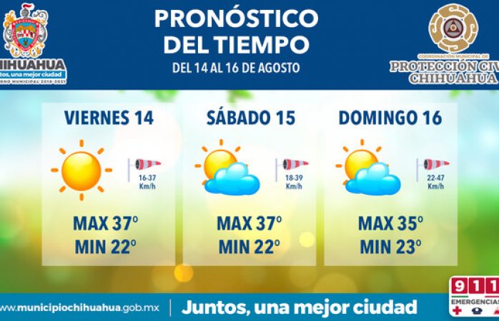 Chihuahua.- Para este fin de semana seguirán las altas temperaturas en la ciudad con hasta 37 grados centígrados, según datos obtenidos por la Coordinación Municipal de Protección Civil, de acuerdo al pronóstico del clima emitido por el Servicio Meteorológico Nacional, aunque habrá nublados escasos que atenuarán la intensidad de los rayos del sol.