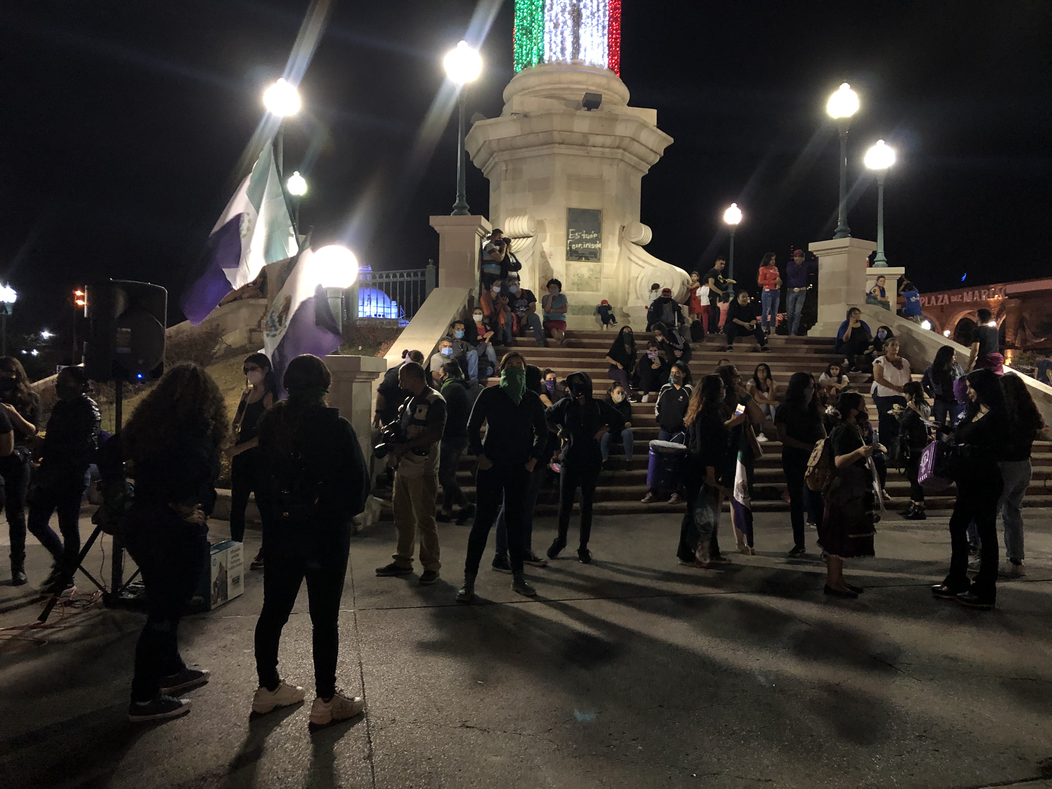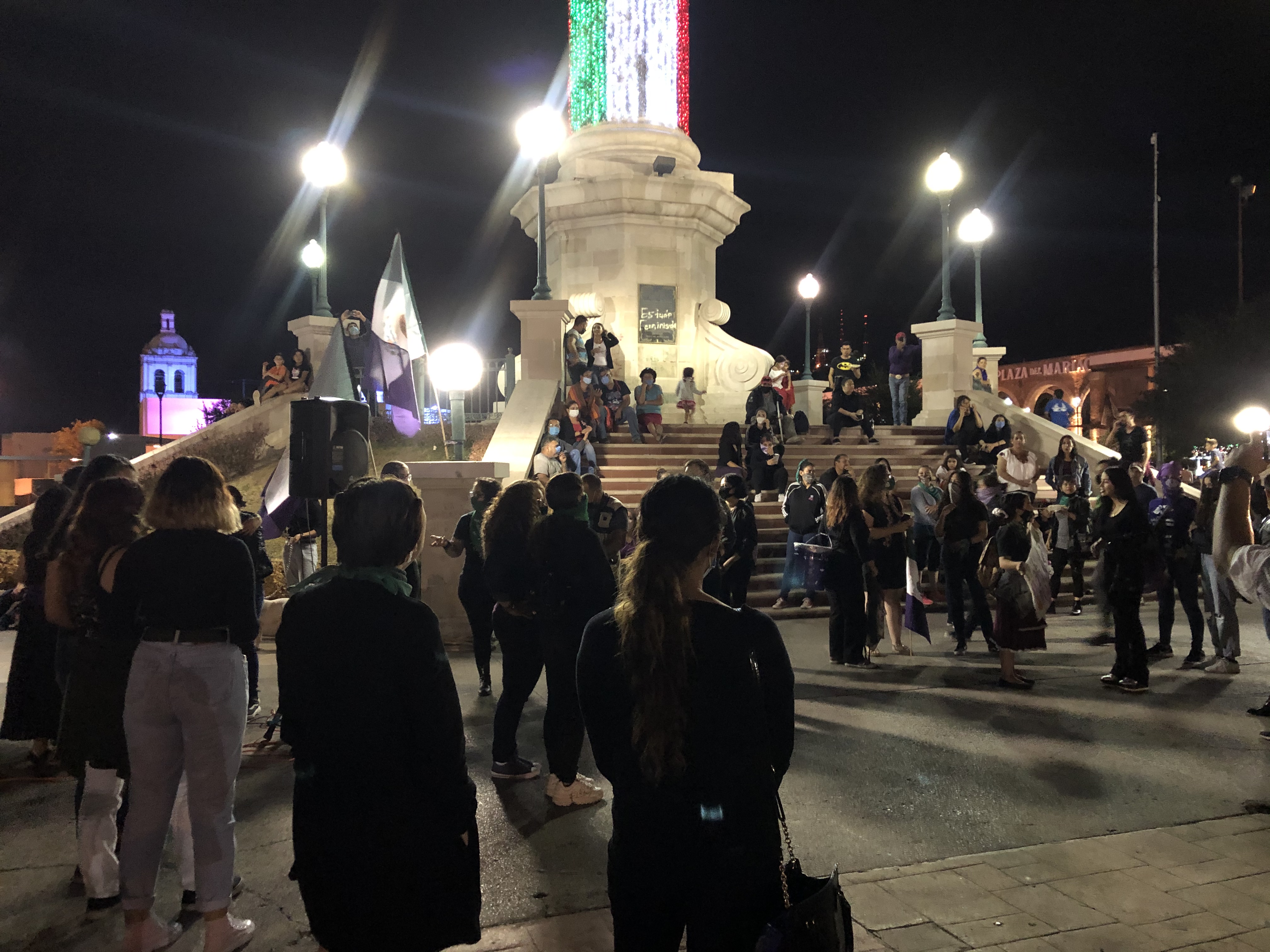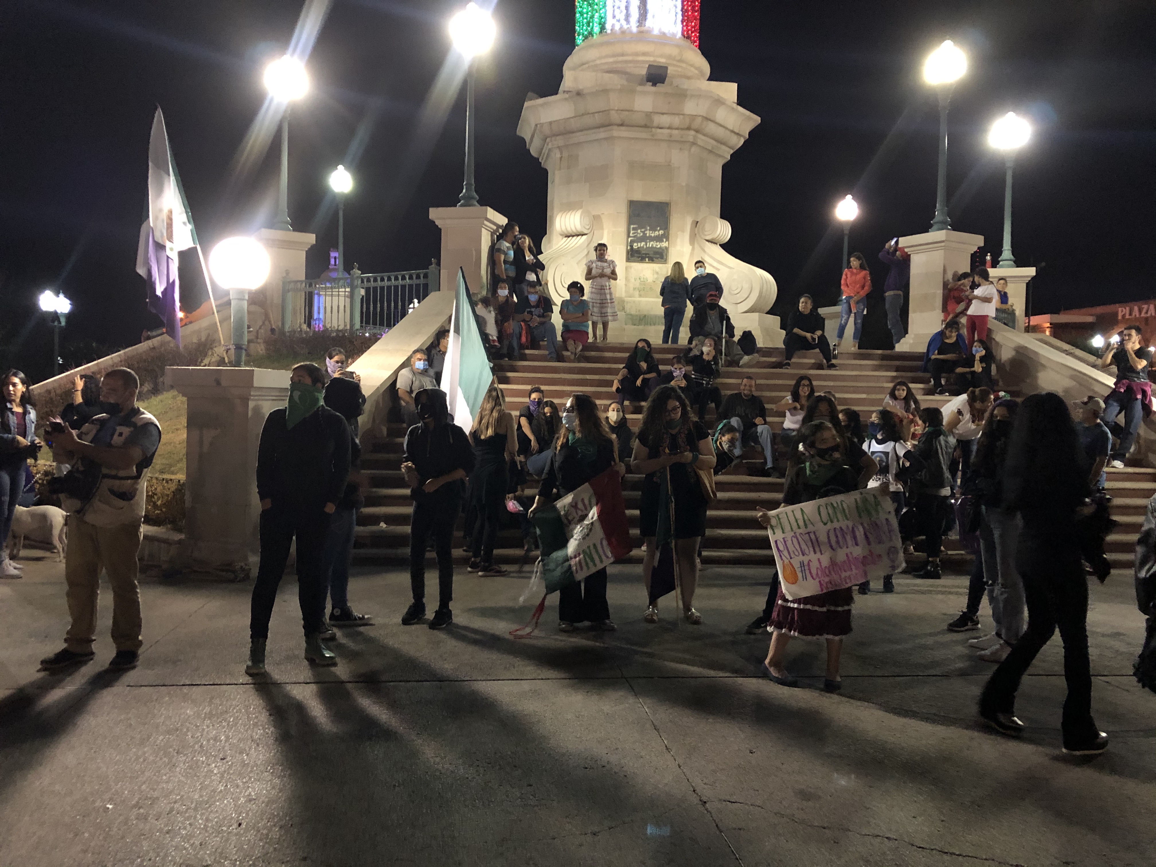 Chihuahua.- Colectivos feministas se plantaron en la plaza del Ángel, para protestar afuera de palacio por los feminicidios.