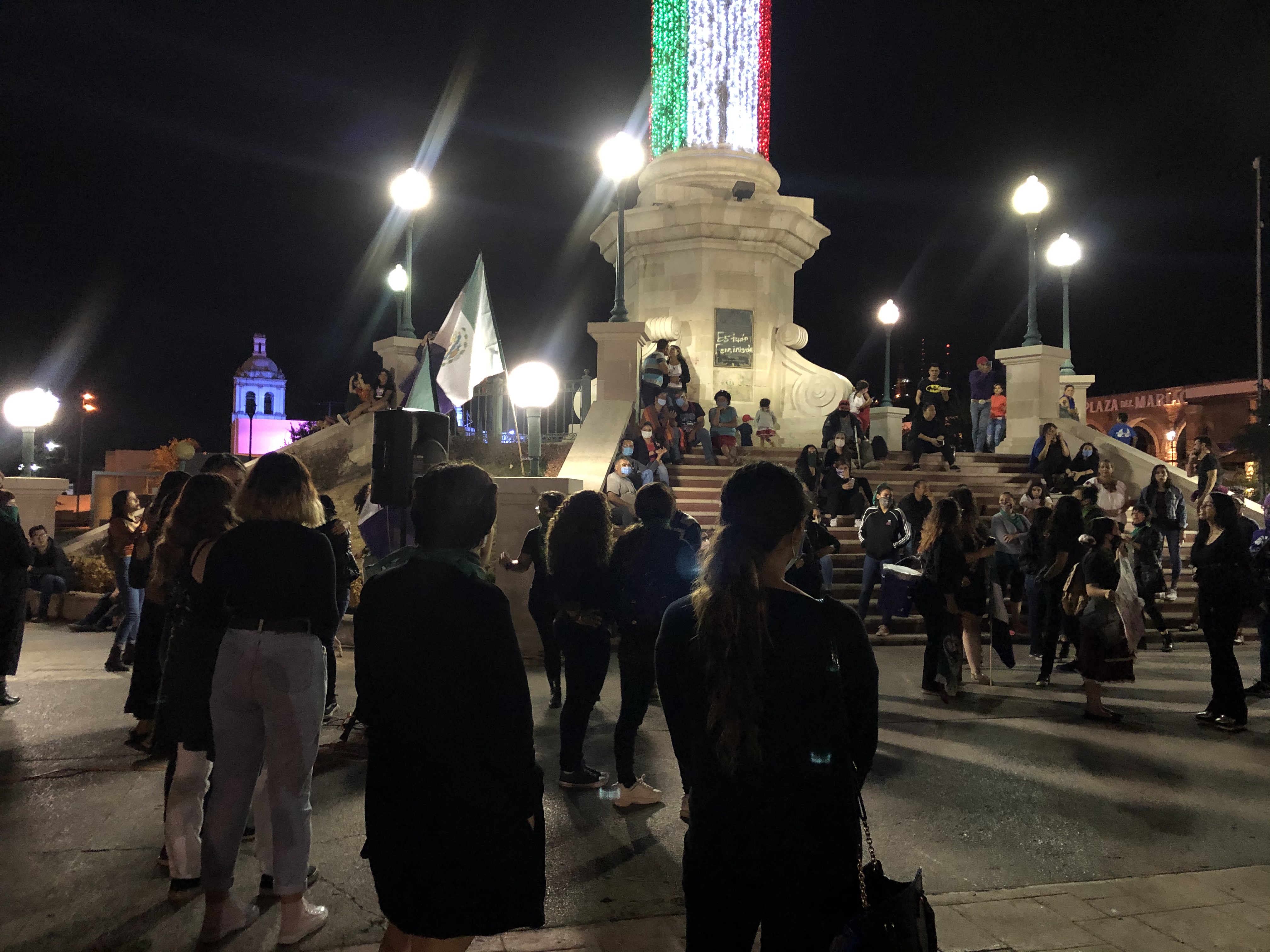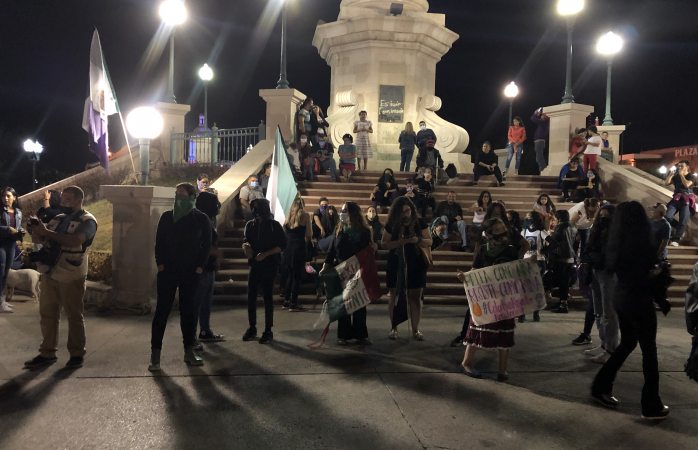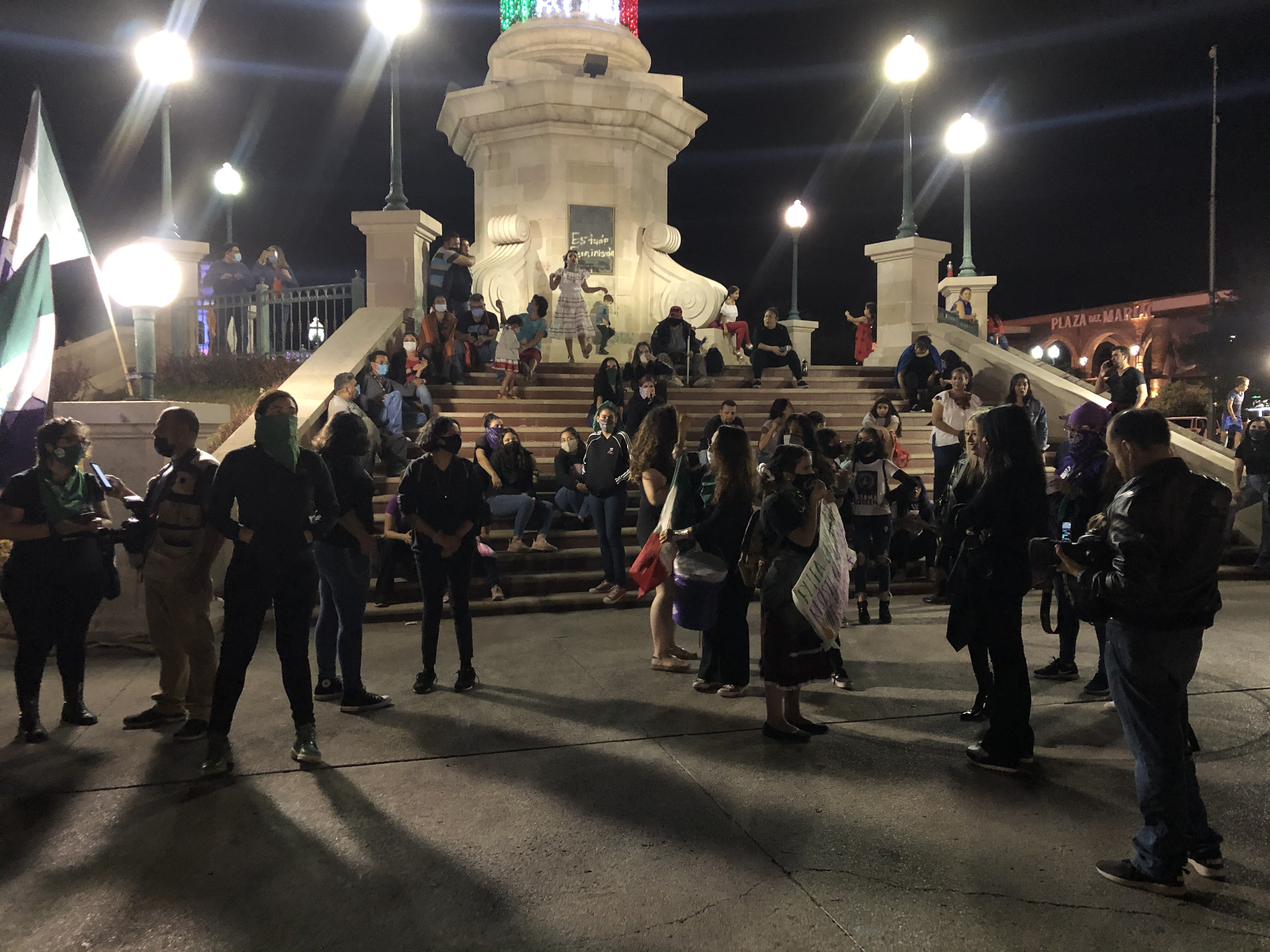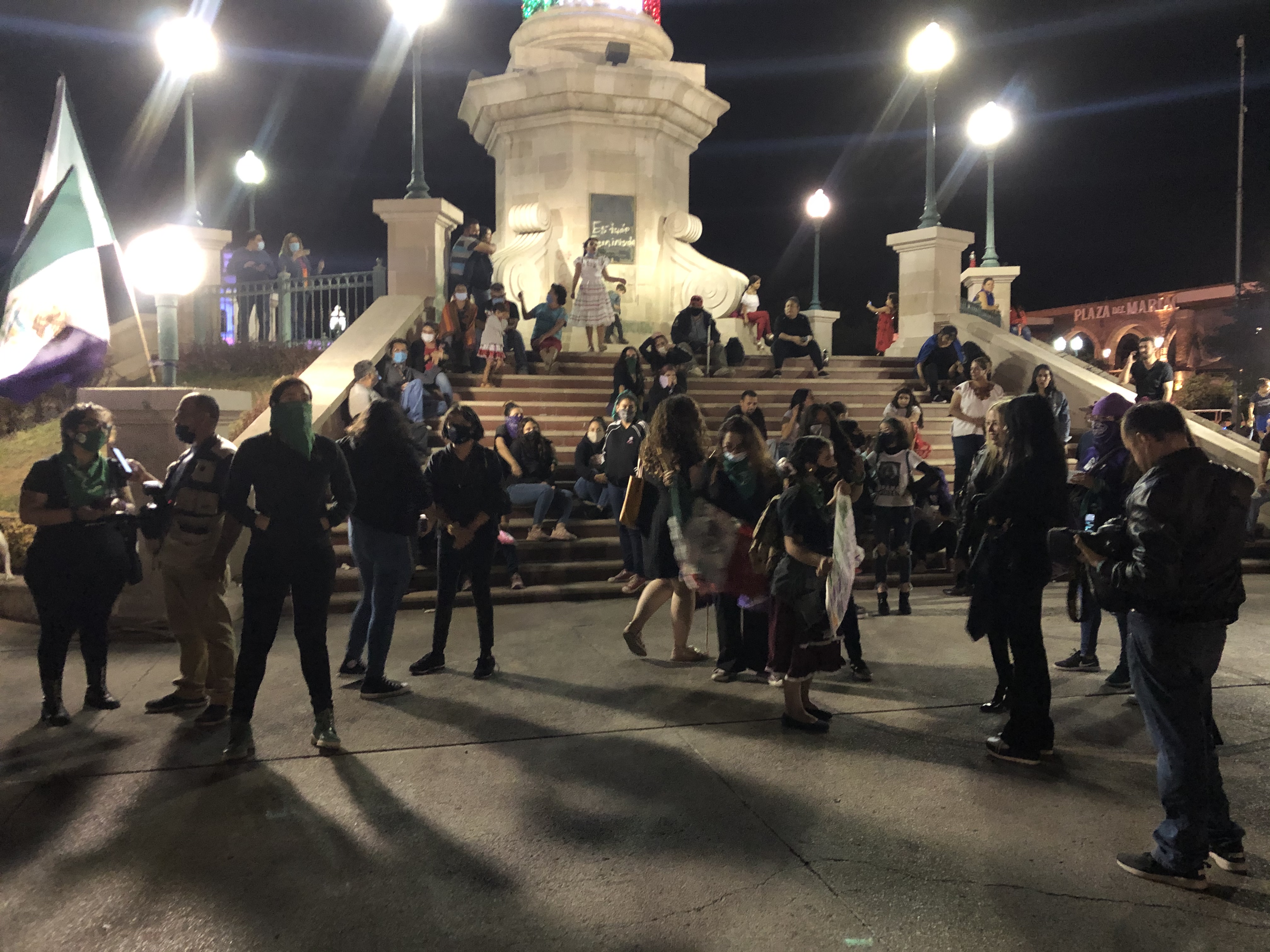 Chihuahua.- Colectivos feministas se plantaron en la plaza del Ángel, para protestar afuera de palacio por los feminicidios.