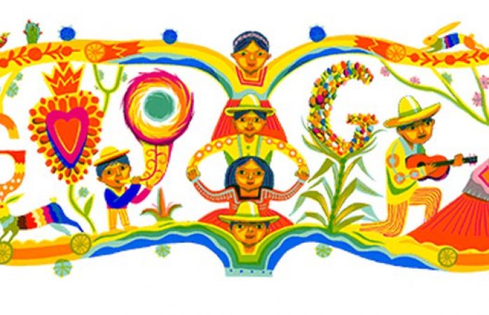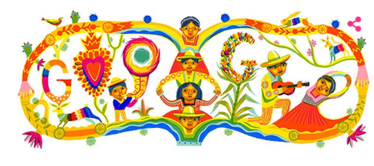 Desde 2005, el buscador más grande del mundo conmemora el 15 de septiembre con un diseño distinto pero característico de México. Este año, reinan los colores cálidos en las pieles de siete personajes que aparecen cantando, tocando instrumentos y unidos en medio elementos naturales como el maíz y el nopal. Además de estar acompañados de algunos animales que se pasean por la imagen.