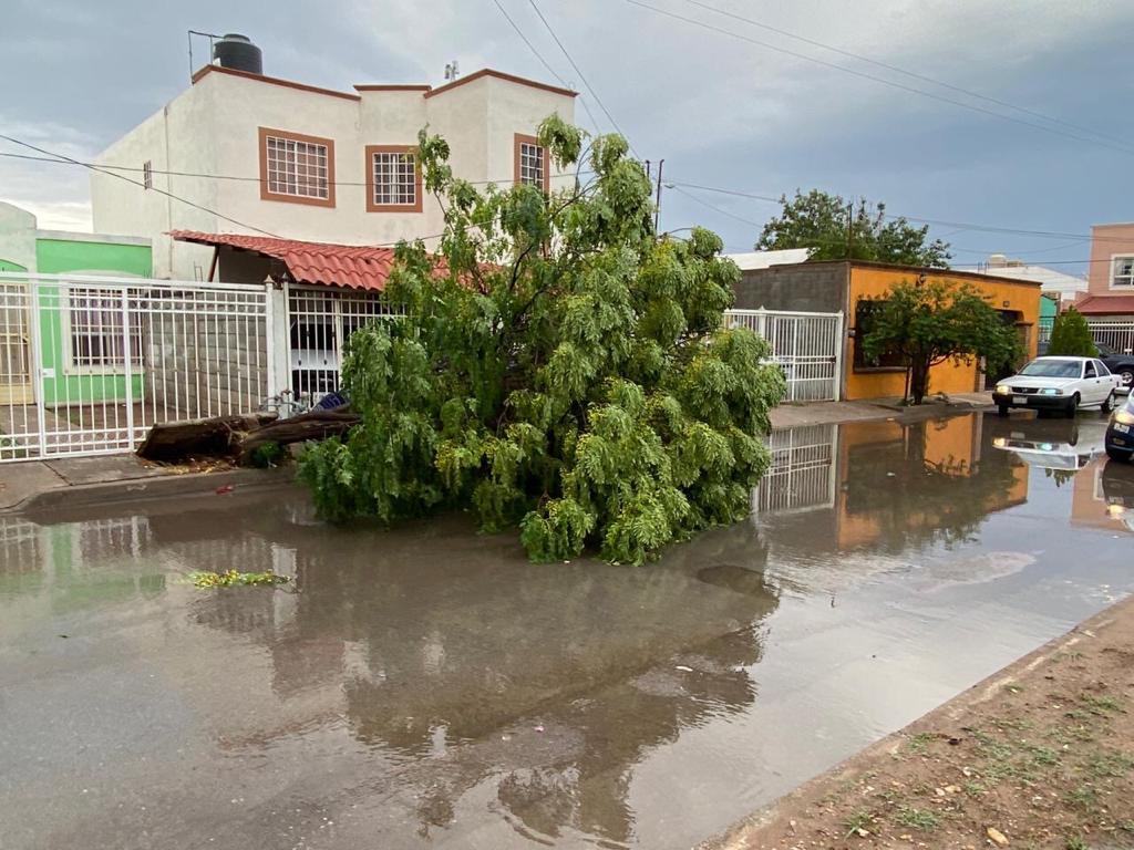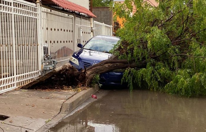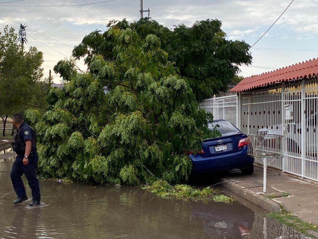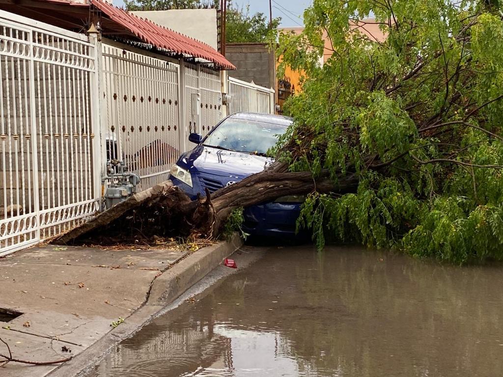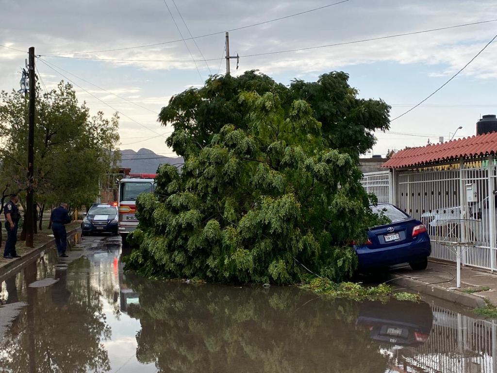 Chihuahua.- Debido a las fuertes lluvias que se registraron esta tarde en la ciudad, un árbol de aproximadamente seis metros se desprendió de la base y cayó sobre un vehículo causando cuantiosos daños materiales.