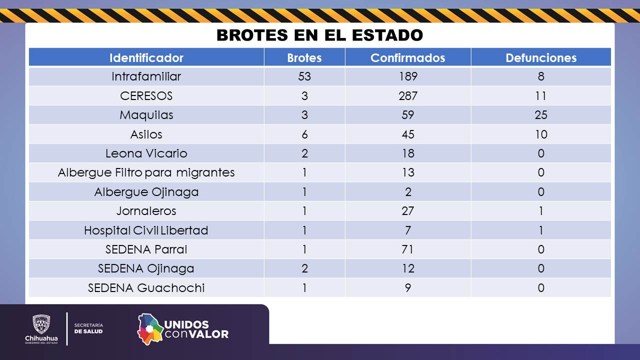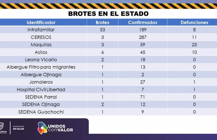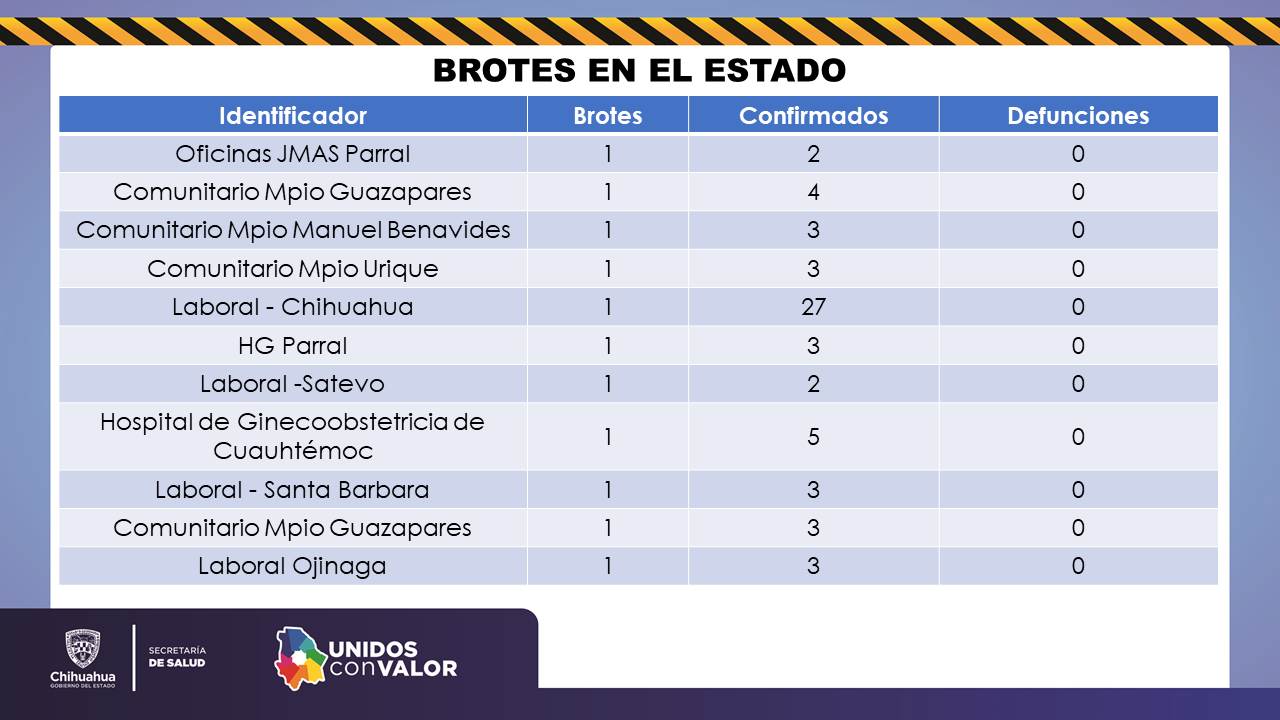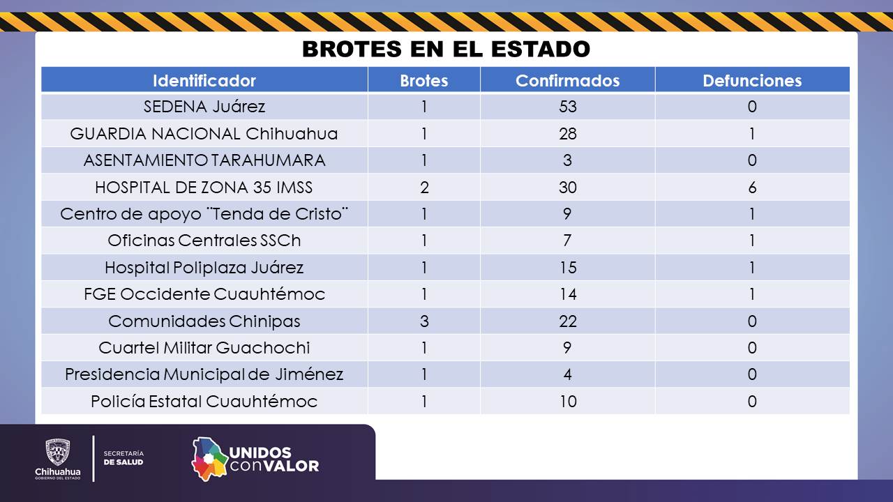 Chihuahua.- El gobierno del estado presentó la actualización de brotes de covid en distintos puntos, cifra que llegó a 100.