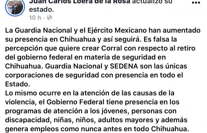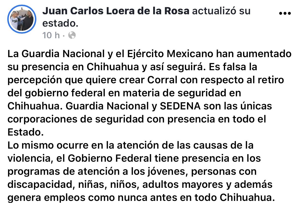 “La Guardia Nacional y el Ejército Mexicano han aumentado su presencia en Chihuahua y así seguirá. Es falsa la percepción que quiere crear Corral con respecto al retiro del gobierno federal en materia de seguridad en Chihuahua”, citó.