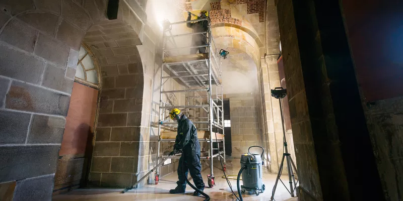 Con el fin de proteger las áreas, las zonas de trabajo se cubrirán. El agua residual, los productos pulverizados y los metales pesados como el plomo se recogerán con dos aspiradores especiales diferentes y se almacenarán en depósitos individuales. Además, los expertos de Kärcher pretenden emplear una ducha para la descontaminación para que ni ellos ni terceras personas entren en contacto con materiales contaminantes.