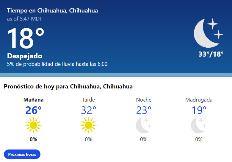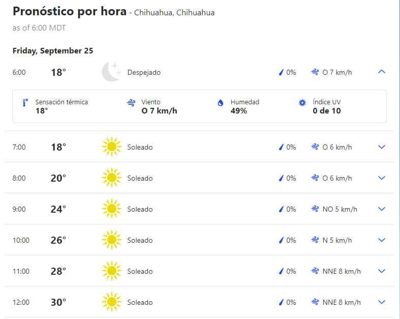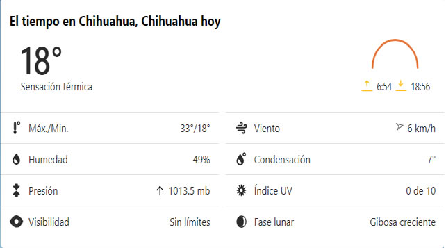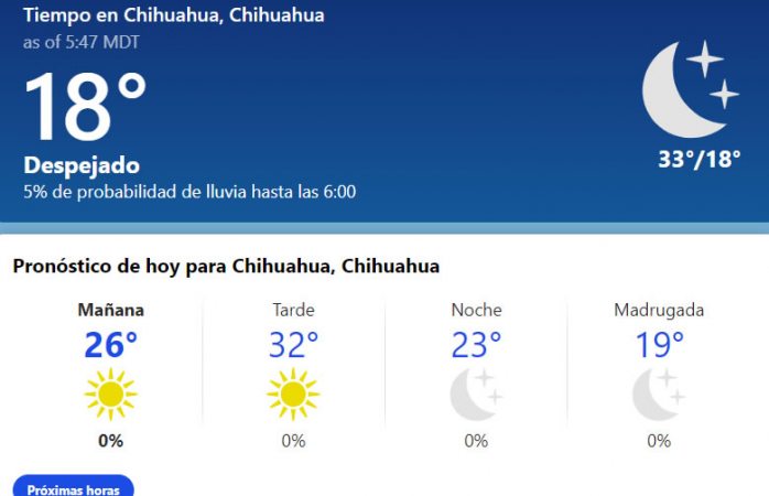 Chihuahua.- Para el día de hoy 25 de septiembre la ciudad de Chihuahua amanece soleado entre las 07:00 y 18:00 horas, se tendrá una noche despejada entre las 19:00 y 23:00 horas.