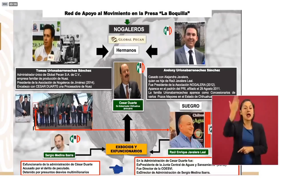 “Un grupo que estuvo operando es el de los nogales, aquí hay una familia que está ligada al exgobernador César Duarte, este grupo es importante porque estuvo atrás en gran medida en el financiamiento de la movilización, por eso advertimos que el supuesto pleito entre Duarte y Corral es testimonial”, comentó durante la mañanera.