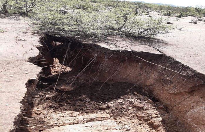 Jimenez.- Se abre la tierra en Jiménez, cual escena apocalíptica el suelo árido de la Vieja Huejoquilla dejó ver parte de sus entrañas, causando expectación y sorpresa de los habitantes del ejido Lagunas, quienes descubrieron el peculiar fenómeno.