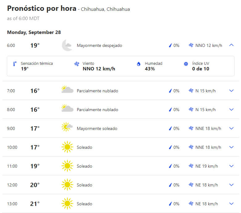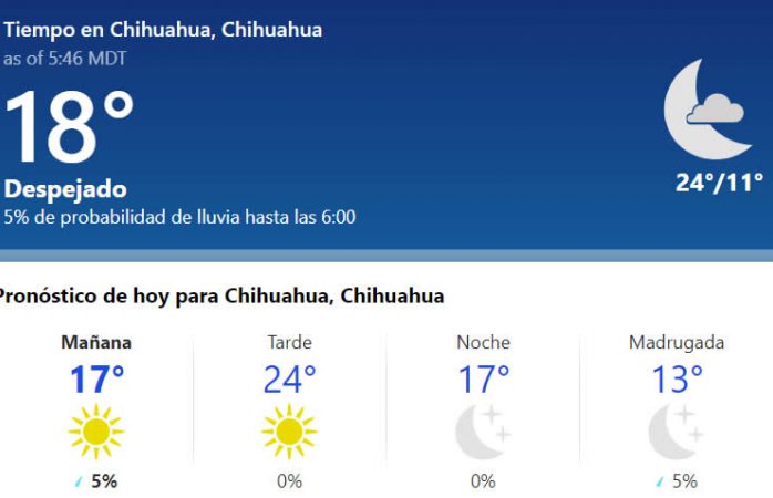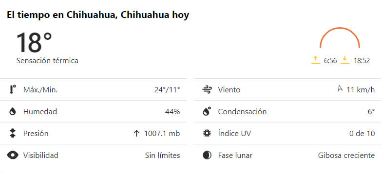Chihuahua.- Para el día de hoy 28 de septiembre la ciudad de Chihuahua amanece soleado entre las 07:00 y 18:00 horas, se tendrá una noche despejada entre las 19:00 y 23:00 horas.