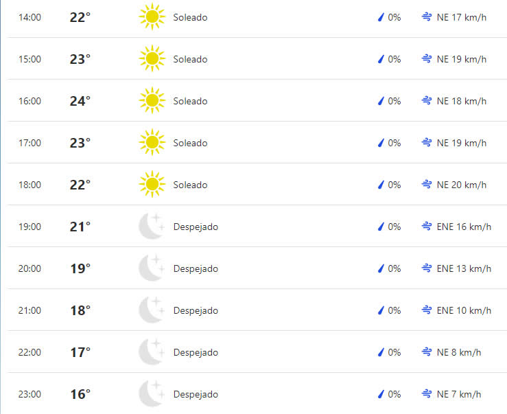 Habrá una humedad del 37 por ciento y existe muy poca posibilidad de lluvias con probabilidad del 0 al 5 por ciento entre las 07:00 y 23:00 horas.