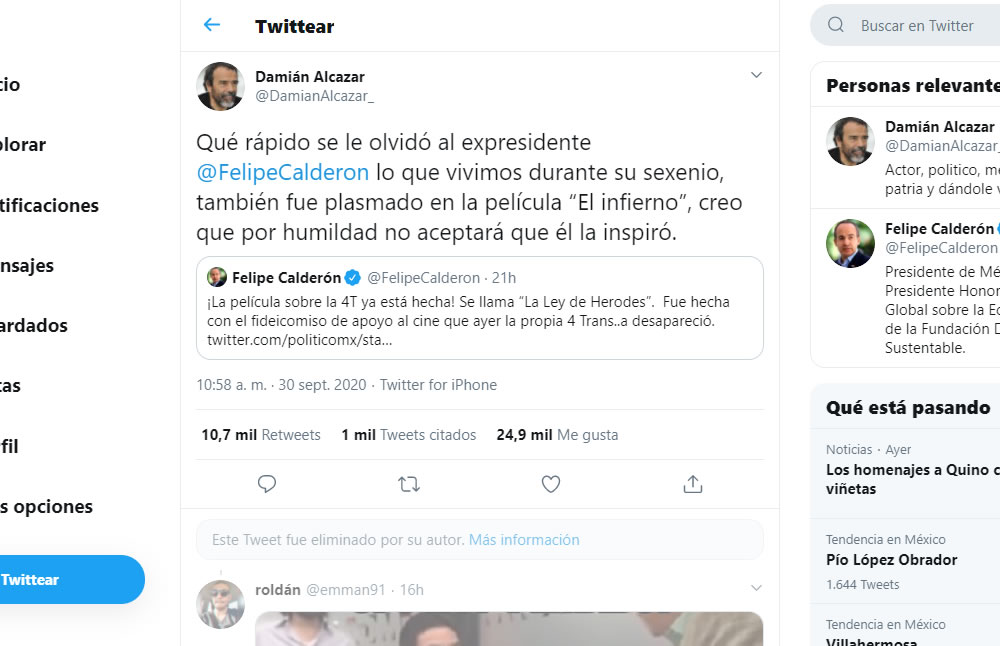 México.- El expresidente Felipe Calderón y el actor Damián Alcázar riñeron en Twitter por el tema de los fideicomisos que han servido para apoyar el cine mexicano.