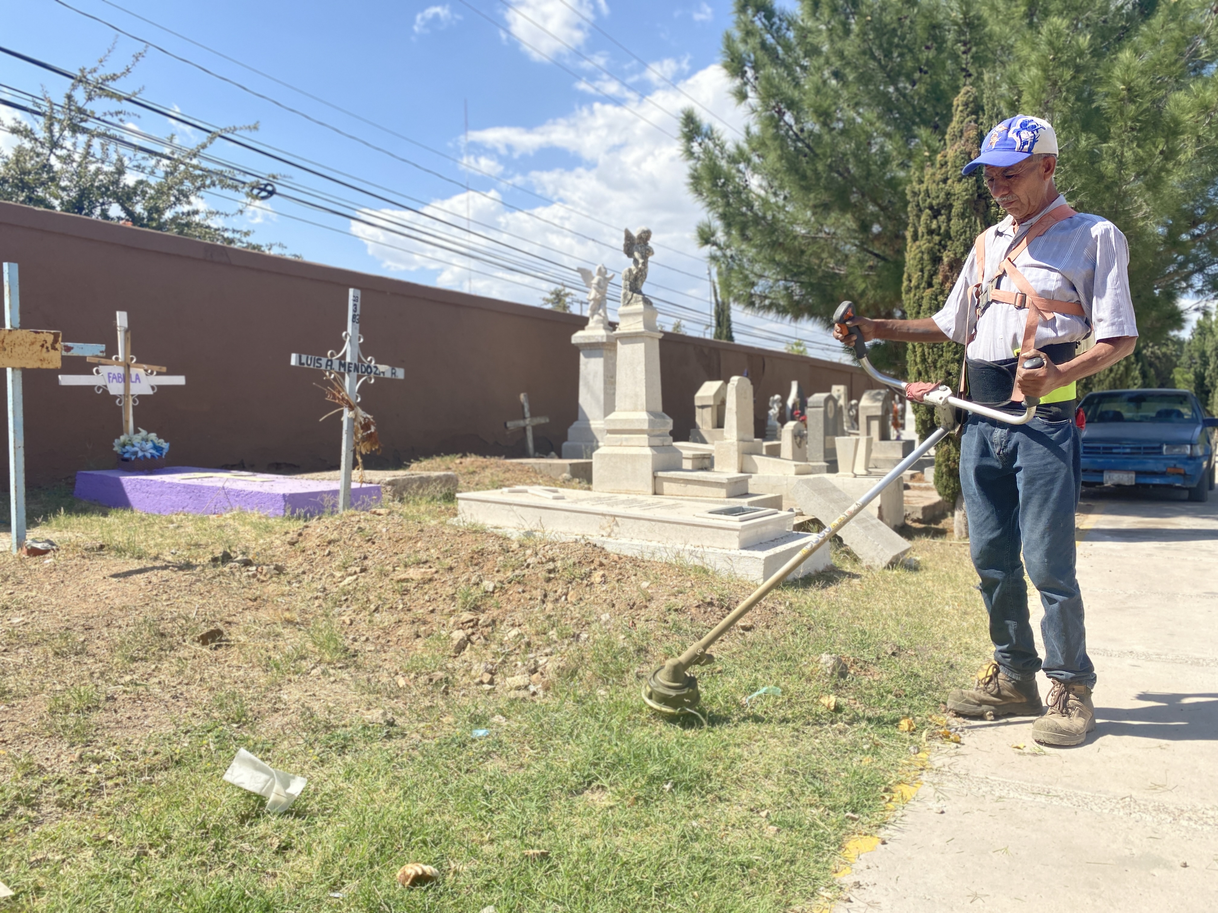 Durante un recorrido por las inmediaciones del panteón municipal #1, personal de jardinería y mantenimiento mantienen en óptimas condiciones las lápidas y pasillos del lugar.