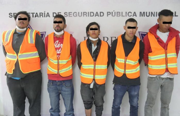 Ciudad Juárez.- Agentes de la Secretaría de Seguridad Pública Municipal realizaron el arresto de Edni R. E., Francisco Javier A. P., Gerardo T. A., Juan Daniel T. R. y Oscar David M. O., por su presunta responsabilidad en la comisión de delitos contra la ley federal de armas de fuego y explosivos y delitos contra la salud.
