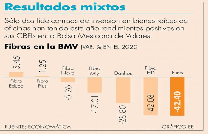 En la Bolsa Mexicana de Valores (BMV), los certificados bursátiles fiduciarios inmobiliarios de Funo presentan en lo que va del año una pérdida de 42.40%, los de Fibra HD caen 42.08%, mientras que los de Danhos cae 28.28% y los de Monterrey tienen una minusvalía de 17.01 por ciento.