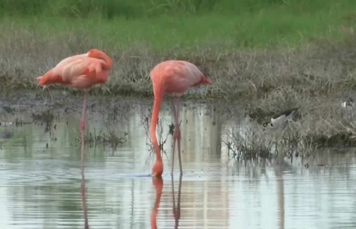 “Aquí se ponen, así están, hay uno allá, hay varios, los flamingos están comiendo los pescaditos, pero como es parte honda allá, buscan la parte baja”, señaló Maritza Chan.
