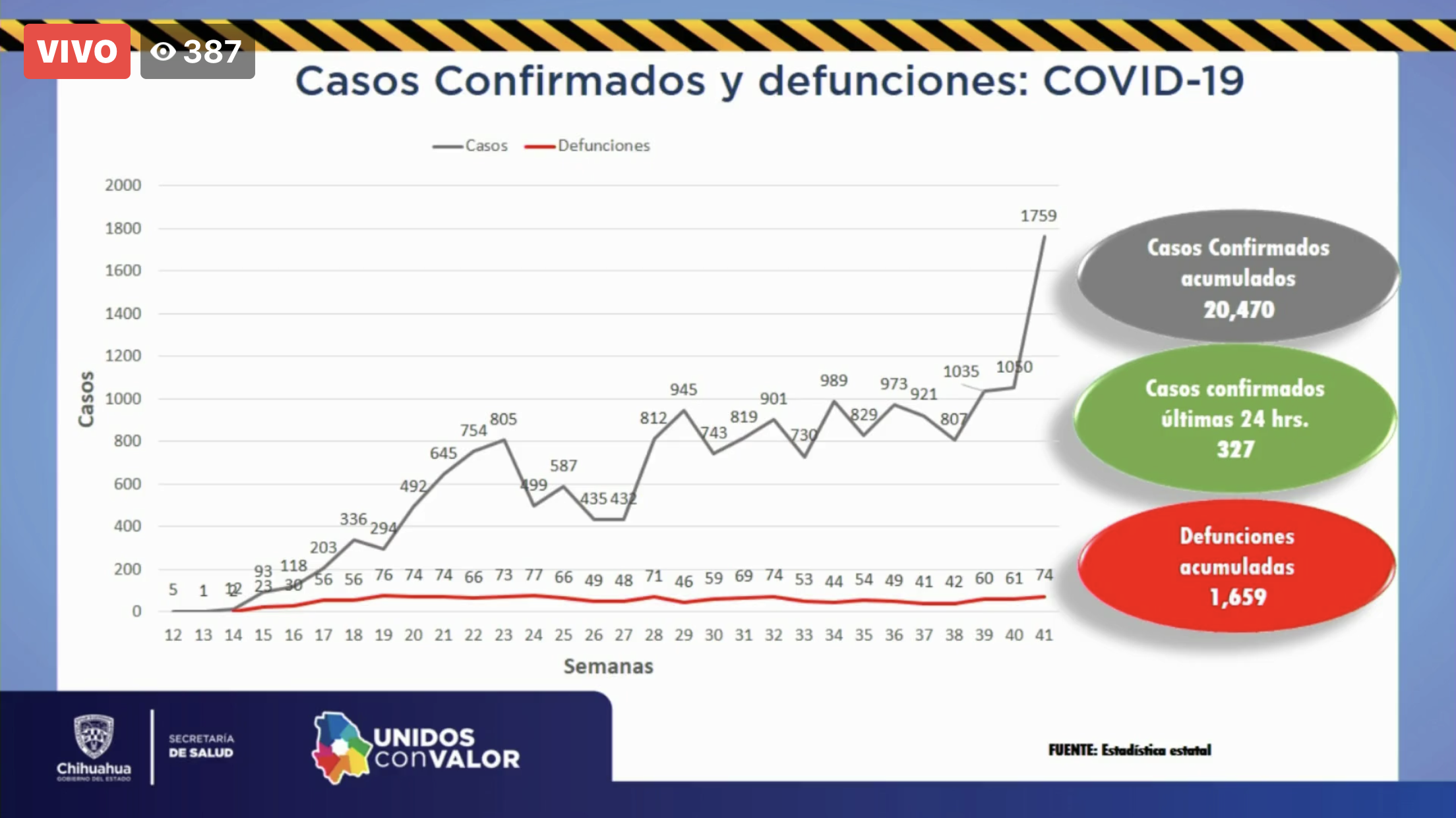 El pico más alto ha sido en la semana 41, que fue la pasada, en donde se sumaron 1 mil 759 contagios de covid en el todo el estado, seguido de la semana 29 en donde se contabilizaron 945 contagios de covid.