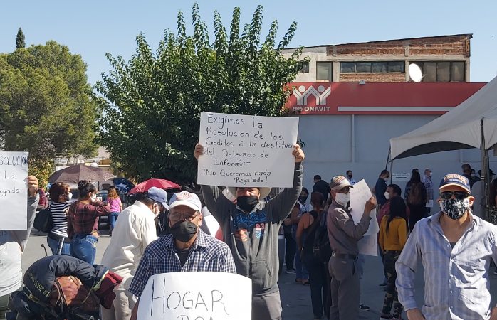 En las pancartas que muestran los manifestantes se puede leer que exigen la destitución del Delegado de INFONAVIT Octavio García.