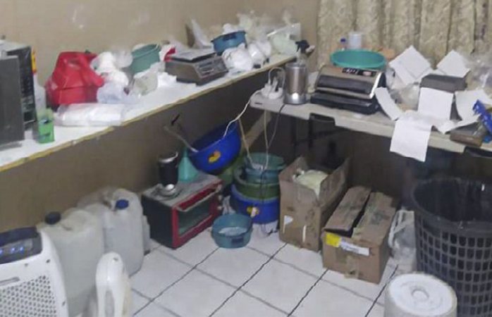 En las imágenes compartidas se observa una especie de prensa mecánica, un cepillo de dientes y una brocha, así como un sartén y un colador, dentro de este último, pequeñas pastillas azules de la presunta droga. El equipo está montado sobre una mesa rudimentaria y botes de pintura. También se muestran galones, un microondas una tostadora y diversos trastos, cartones y bolsas con polvo.
