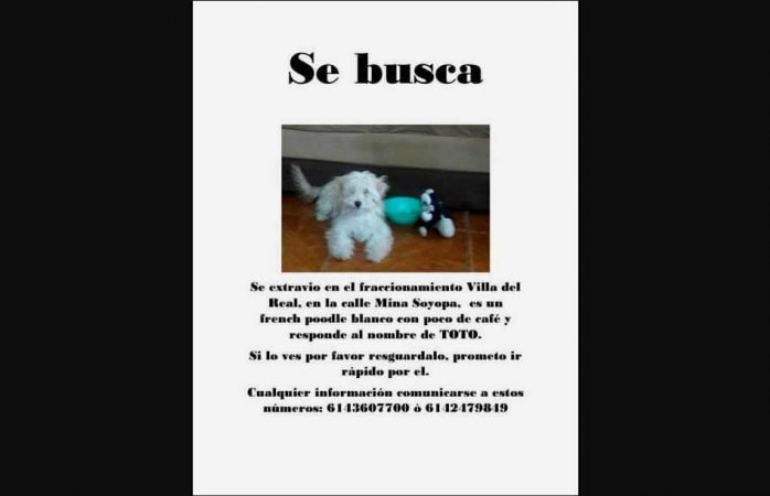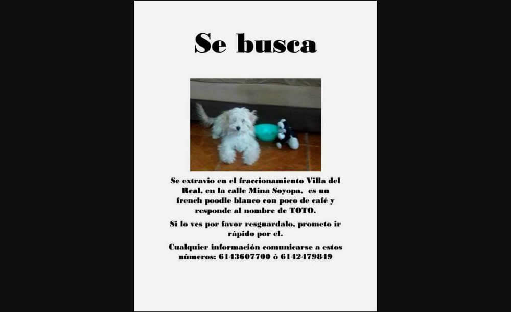 Chihuahua.- A través de este medio solicitan el apoyo de la ciudadanía para localizar a perro French Poodle que se extravió en el fraccionamiento Villas del Real.