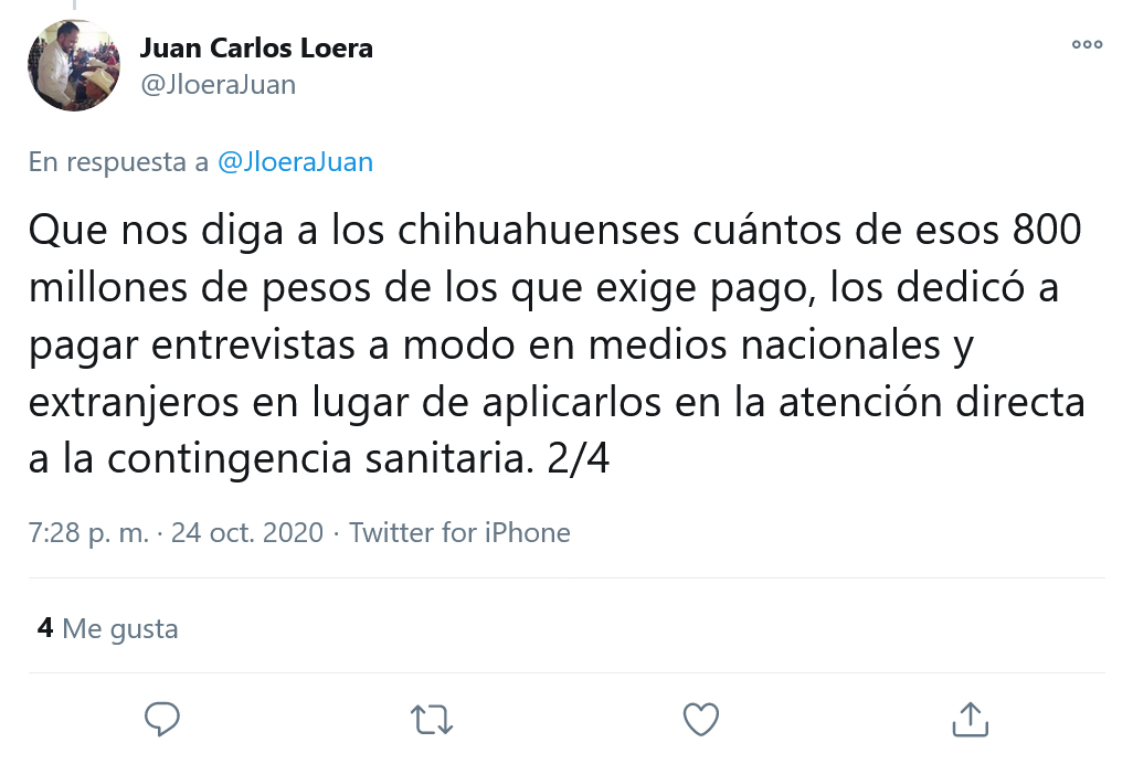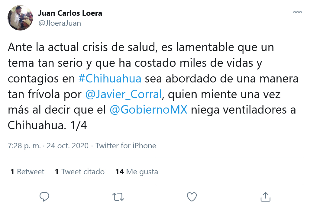 Chihuahua.- Juan Carlos Loera de la Rosa, Delegado Federal de Bienestar, indicó mediante una publicación en su cuenta de Twitter acerca de las mentiras por parte del gobernador del estado, Javier Corral Jurado al referirse que mintió al decir que el gobierno de México negó ventiladores a Chihuahua.