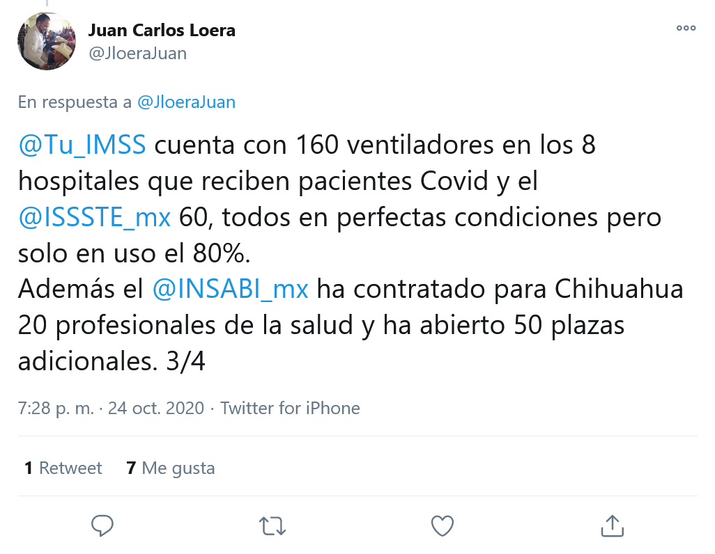 El delegado indicó que el IMSS cuenta con 160 ventiladores en los 8 hospitales que reciben pacientes Covid y el ISSSTE 60, todos en perfectas condiciones, pero solo en uso el 80%, además el INSABI ha contratado para Chihuahua 20 profesionales de la salud y ha abierto 50 plazas adicionales.