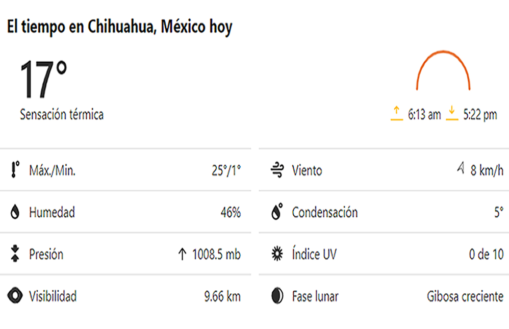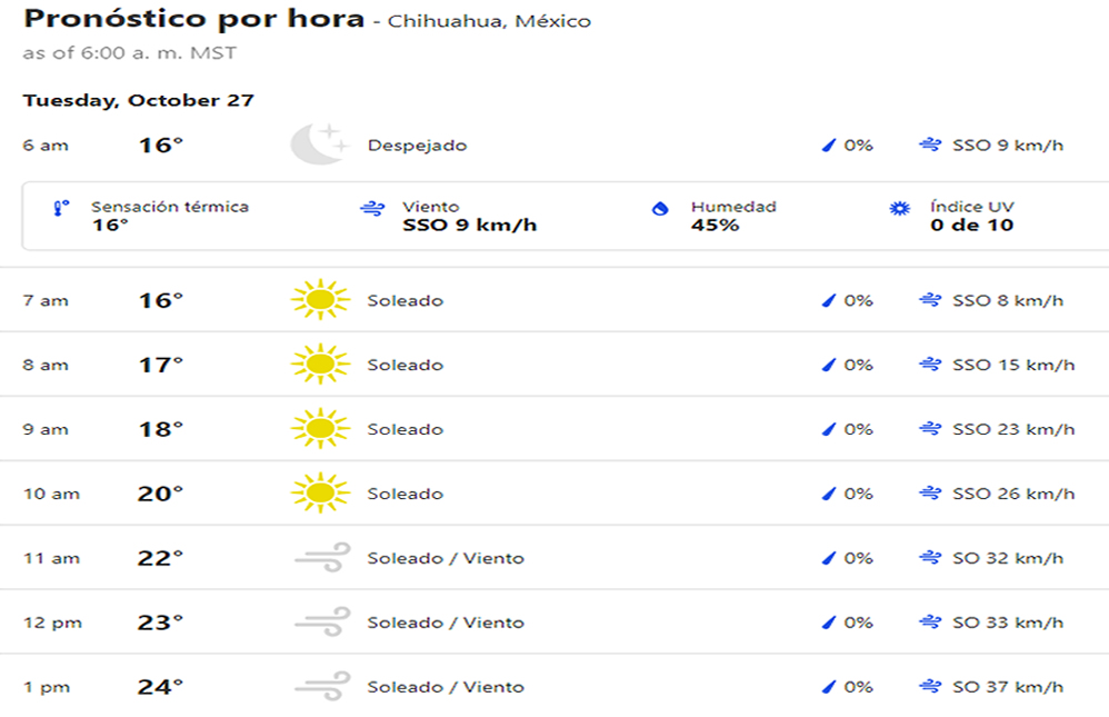 Chihuahua. - Hoy martes amaneció soleado con ráfagas de vientos que oscilarán entre los 13km/h, y podrán alcanzar hasta los 32km/h.