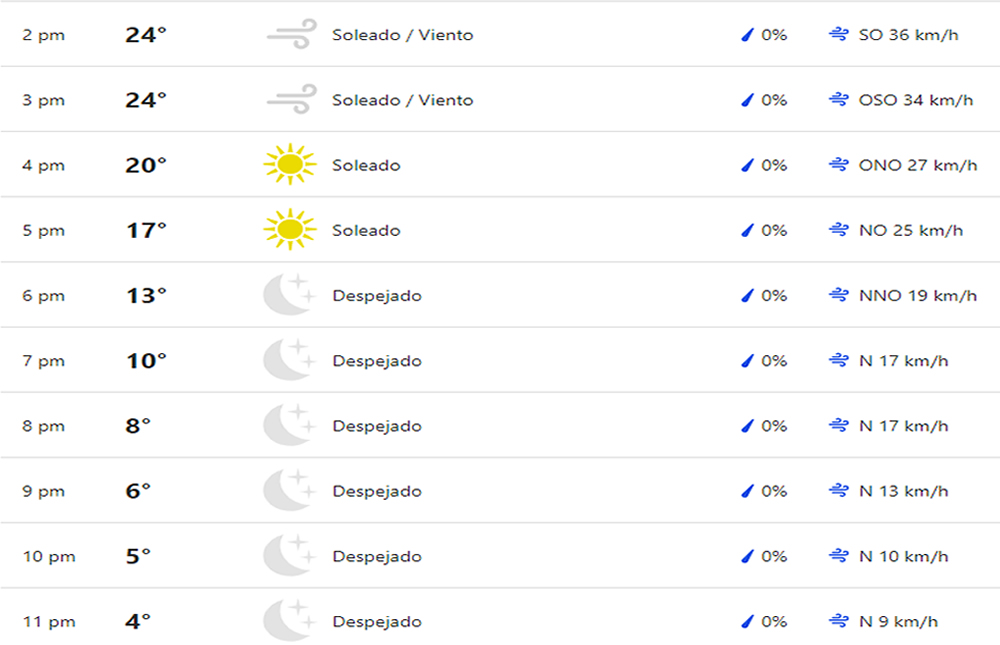 Se mantendrá soleado entre las 07:00 a las 10:00 horas, estará con viento entre las 11:00 a las 15:00 horas, y se mantendrá despejado entre las 16:00 y 23:00 horas.