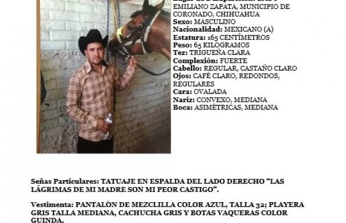 Chihuahua.- La Fiscalía de Distrito Zona Sur efectúa las acciones necesarias que permitan localizar a Francisco Javier Talamantes Vargas de 30 años, quien fue visto por última vez el 18 de octubre, en el Ejido Emiliano Zapata, municipio de Coronado; por lo cual se implementaron los mecanismos de búsqueda a fin de dar con su paradero.