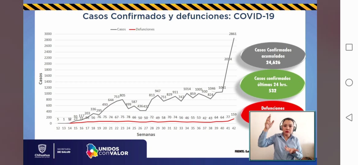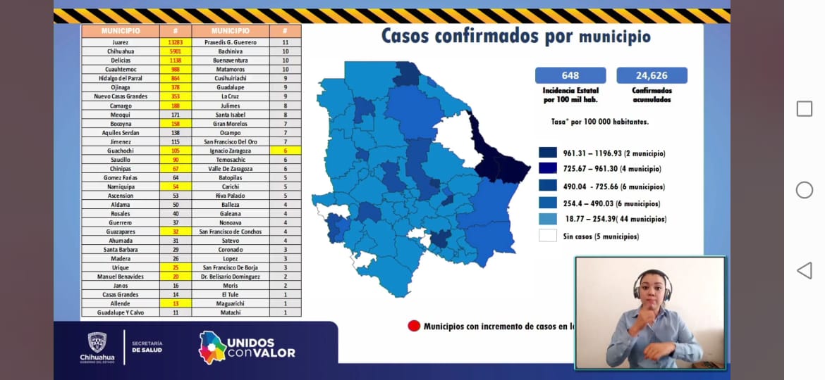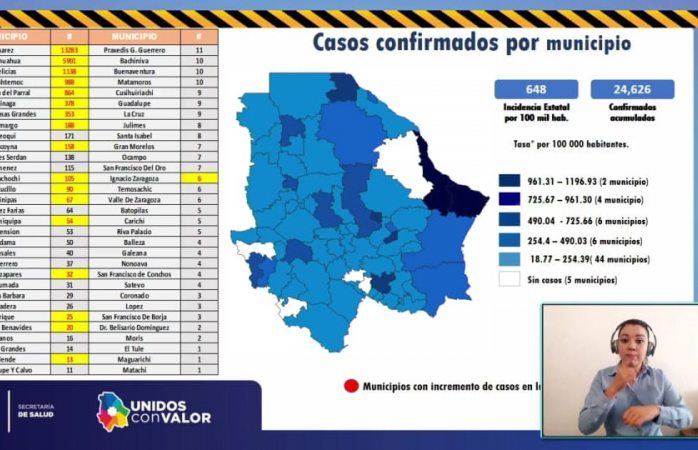 Los municipios donde registraron al menos un nuevo contagio de coronavirus fueron Juárez, Chihuahua, Delicias, Cuauhtémoc, Parral, Ojinaga, Nuevo Casas Grandes, Camargo, Bocoyna, Guachochi, Saucillo, Chinipas, Namiquipa, Guazapares, Urique, Manuel Benavides, Allende e Ignacio Zaragoza.