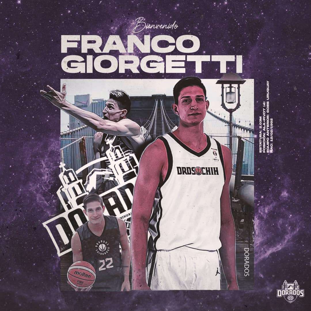 Chihuahua.- Franco Giorgetti se incorpora a las filas de Dorados del Estado de Chihuahua para la temporada 2022 de Liga Nacional de Baloncesto Profesional (LNBP), después de militar para el cuadro Goes en Uruguay.