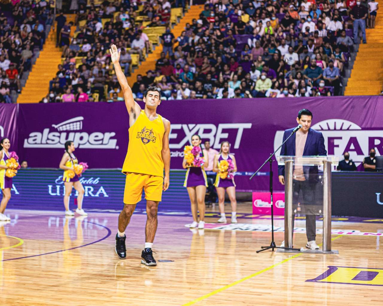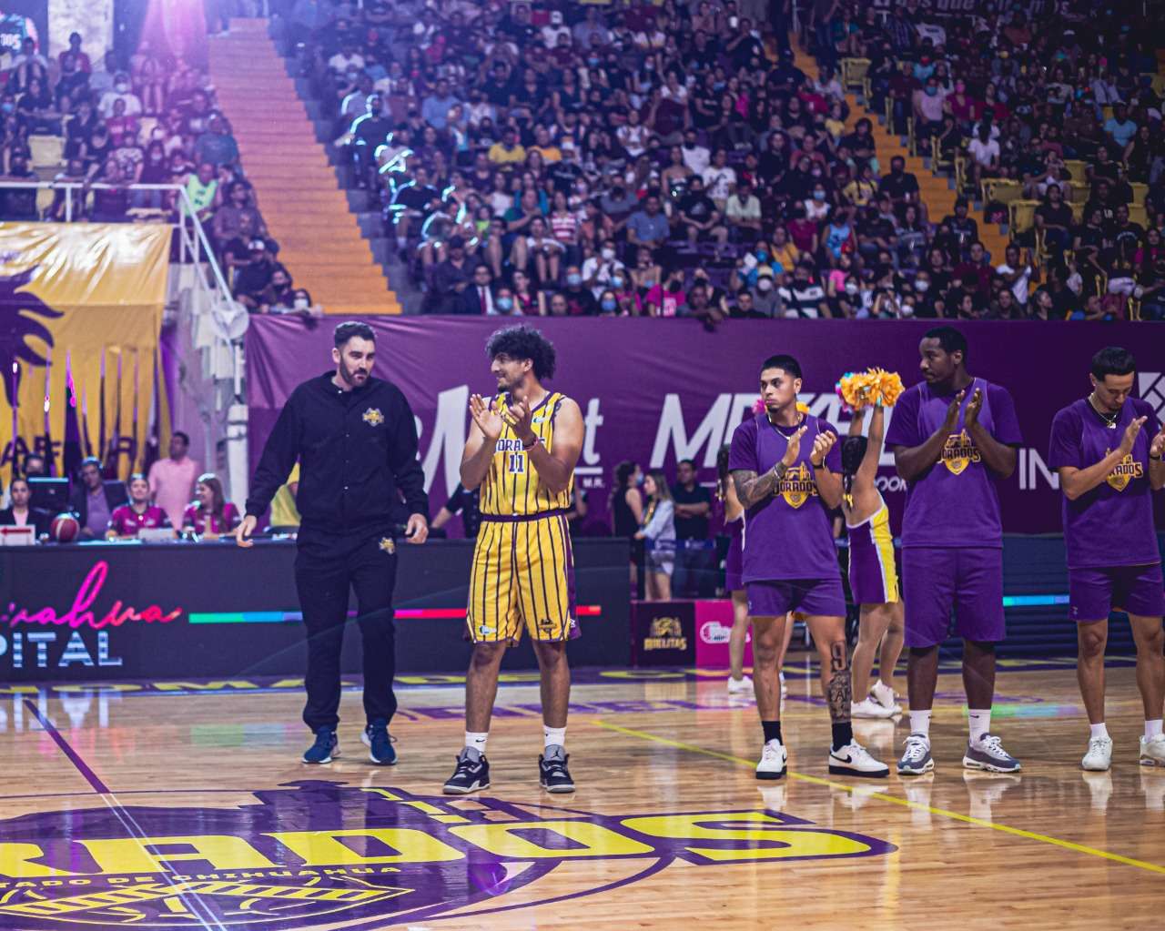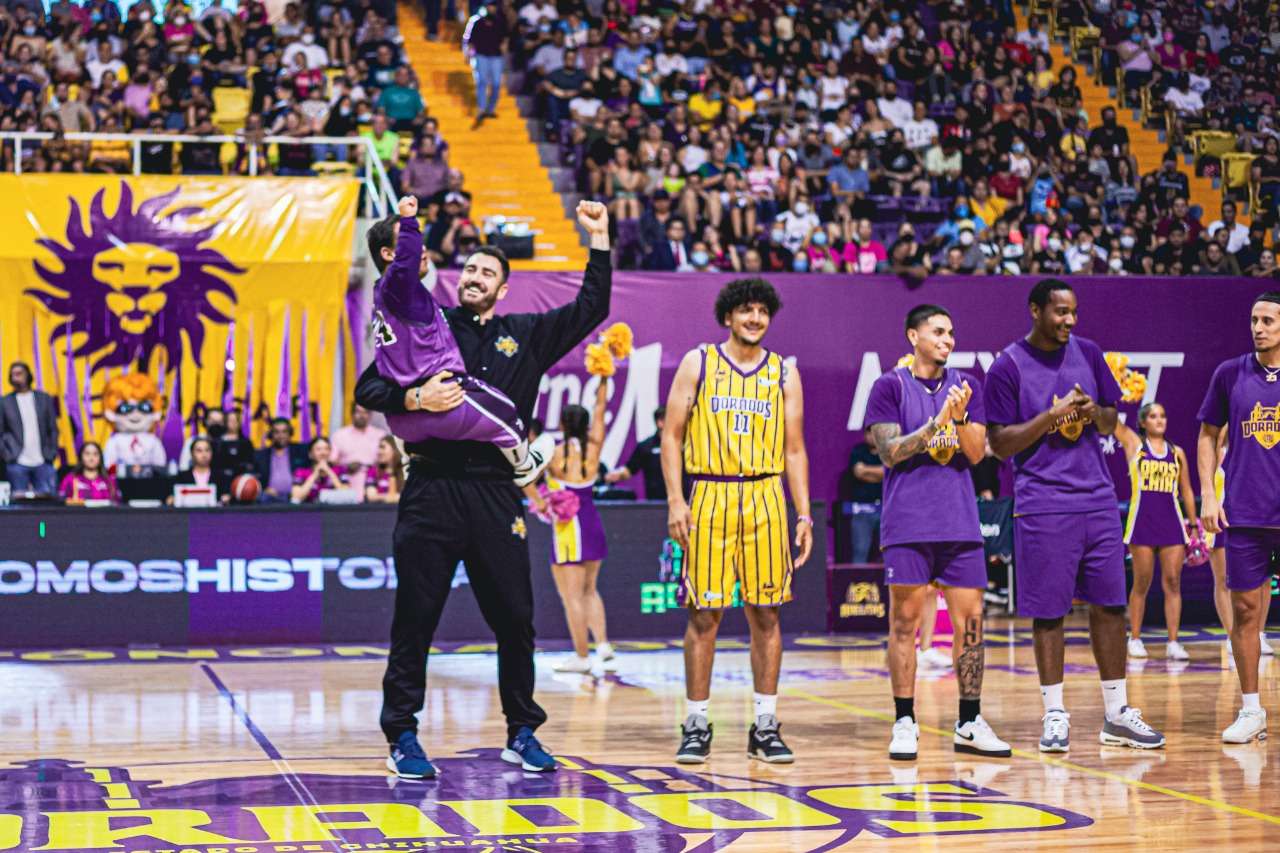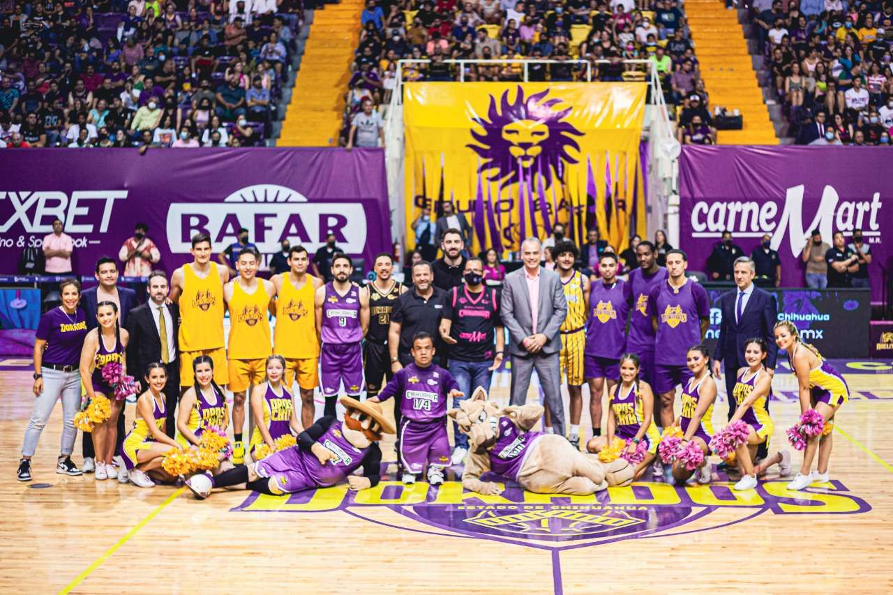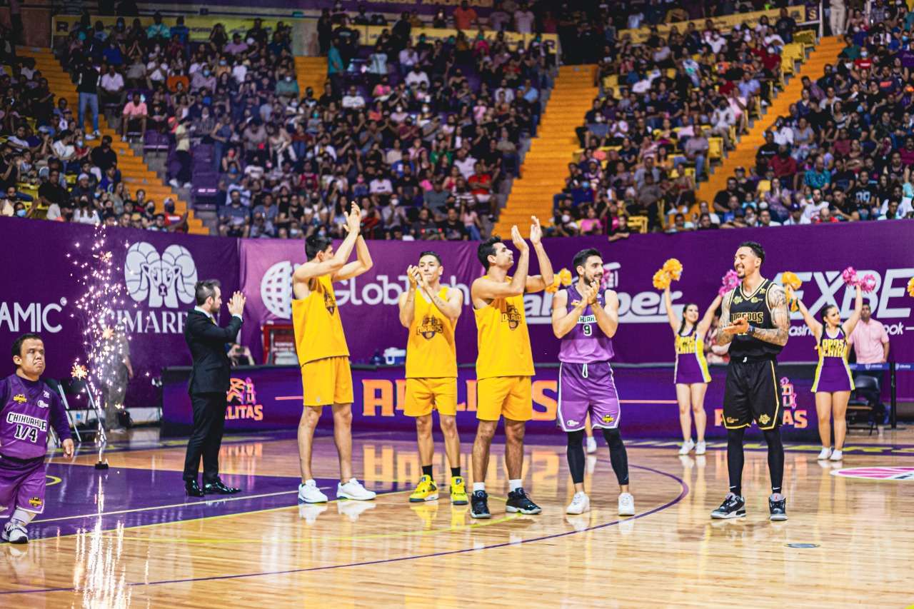 Chihuahua.- El Club Dorados del Estado de Chihuahua presentó a sus jugadores que formarán parte en la temporada 2022 de la Liga Nacional de Baloncesto Profesional (LNBP), ante 9 mil 500 aficionados que se dieron cita en el Gimnasio Manuel Bernardo Aguirre (MBA) en el encuentro de las Finales de la Liga Femenil entre Adelitas y Astros de Jalisco.