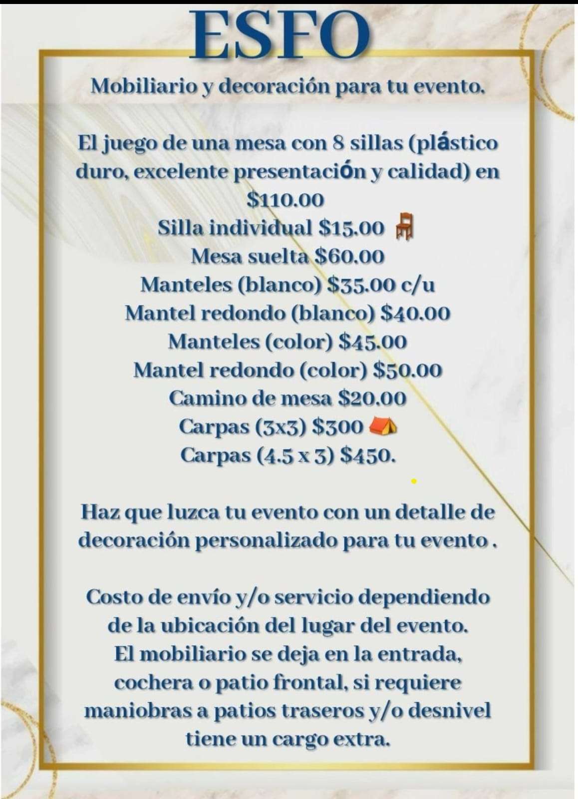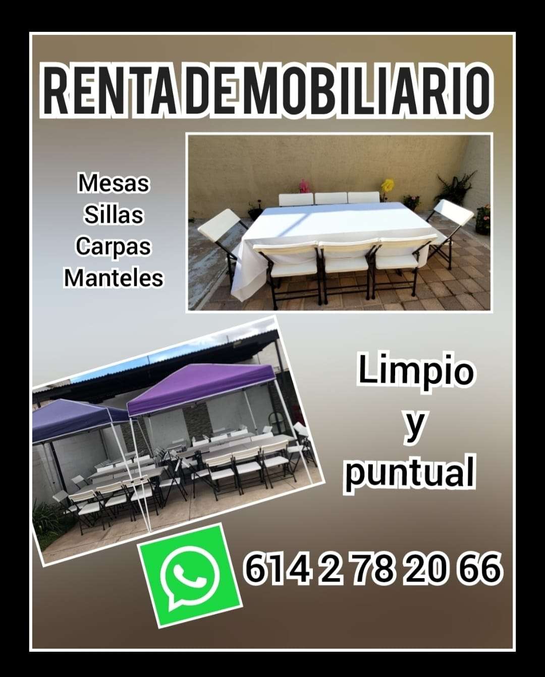 Renta de mesas, sillas, manteles, carpas y centros de mesa. Decoración, guirnalda de globos y más..... informes al 614 278 2066 o bien da clic para informes por WhatsApp https://wa.link/koni6y