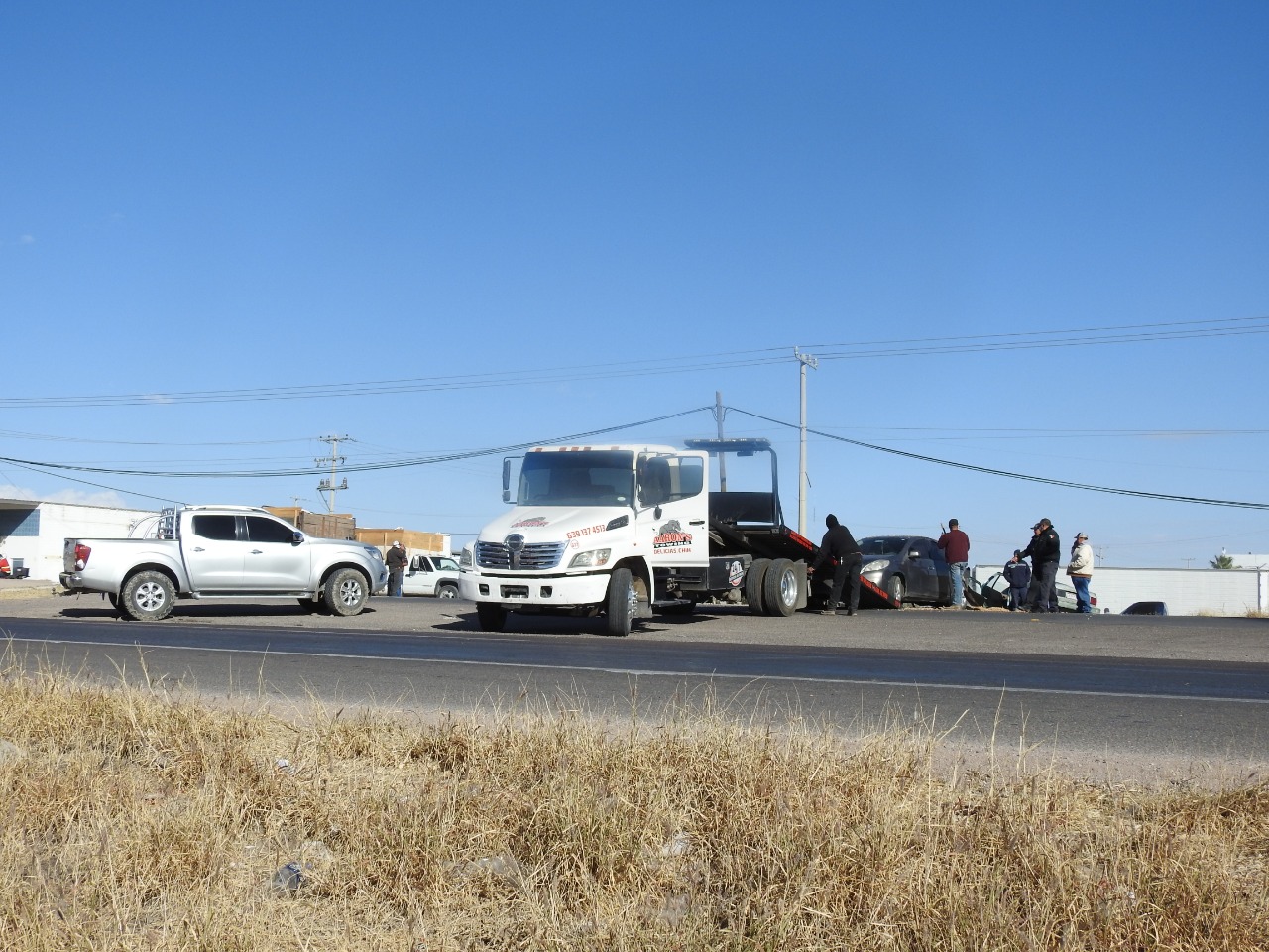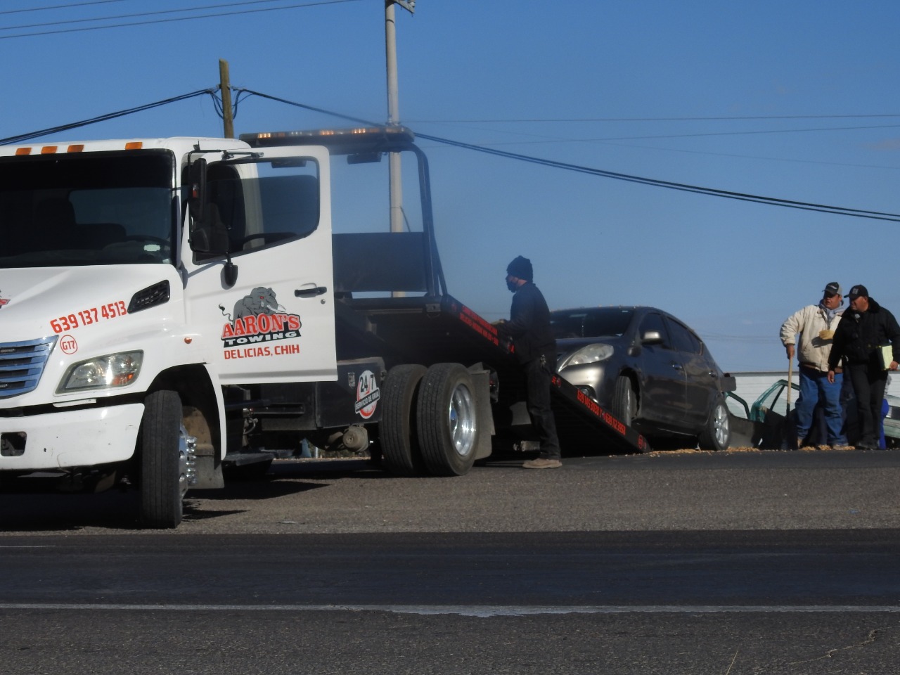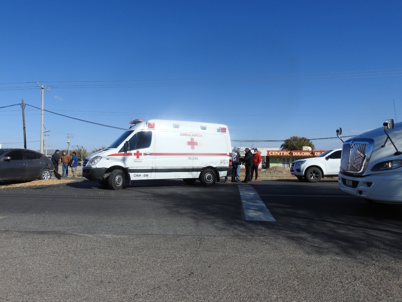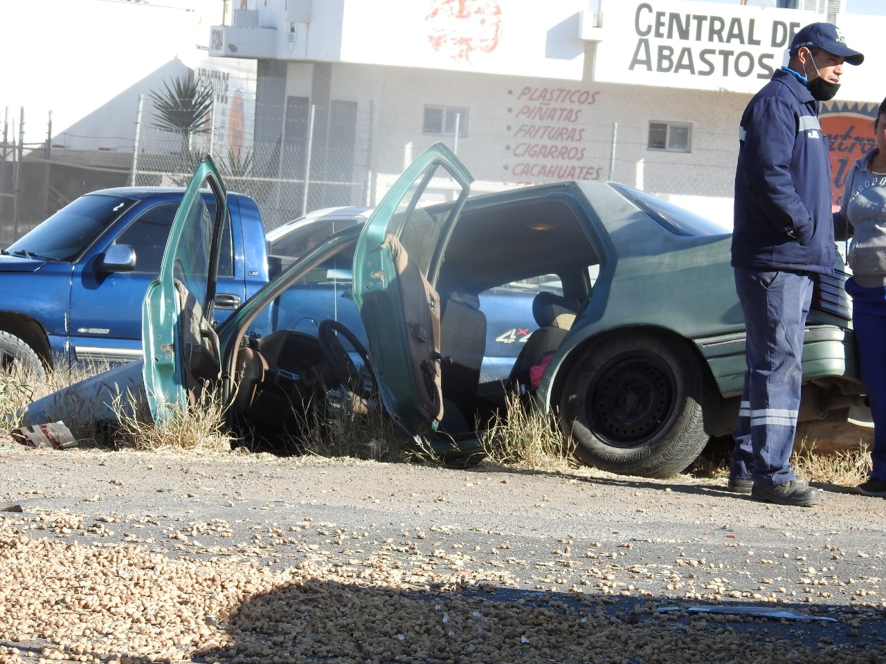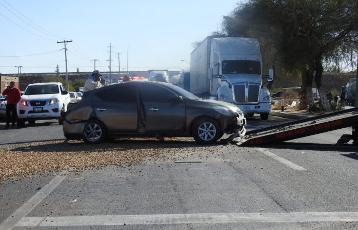 Delicias.- Una mujer y una niña sufrieron heridas leves luego de registrarse un choque tipo carambola en em que participaron tres automóviles y un camión cargado con cacahuates sobre la carretera federal a la altura de la Central de Abastos.