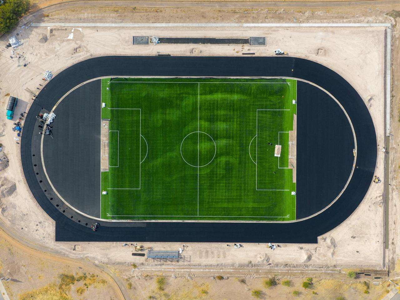 Rodríguez Porras destacó que, de manera paralela, la cancha de fútbol ya se encuentra completamente marcada y pintada, con las líneas delimitantes debidamente definidas, así como las porterías ya instaladas, lo que representa un avance significativo en el proyecto.