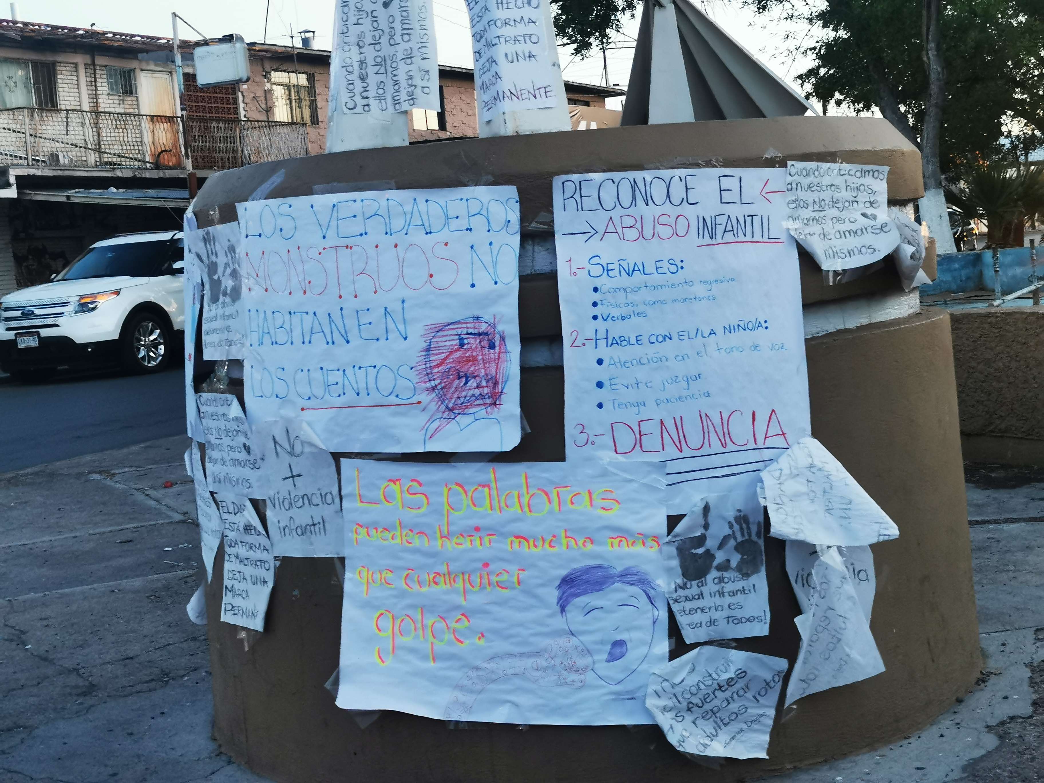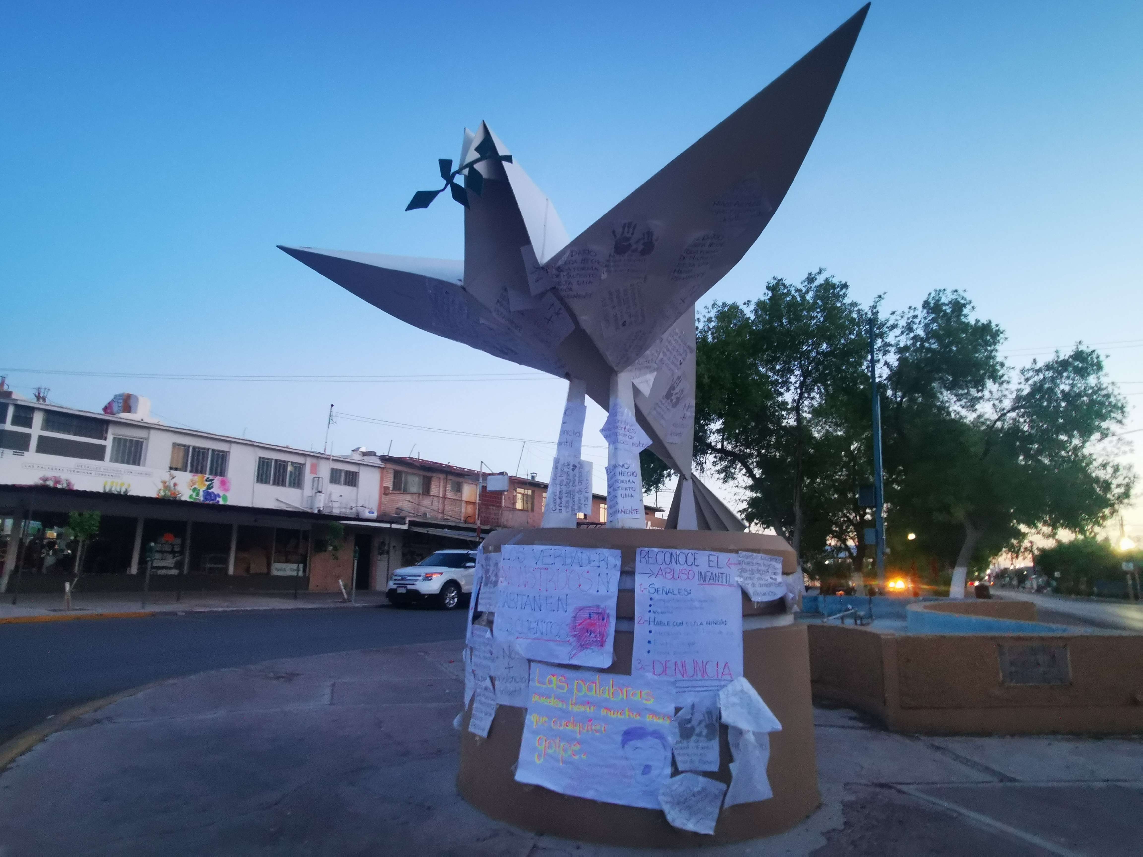 Delicias.- El maltrato infantil va en aumento con motivo de la pandemia y luego del festejo a los reyes del hogar fueron colocados mensajes alusivos a combatir este delito, justo en La Paloma de la Paz.