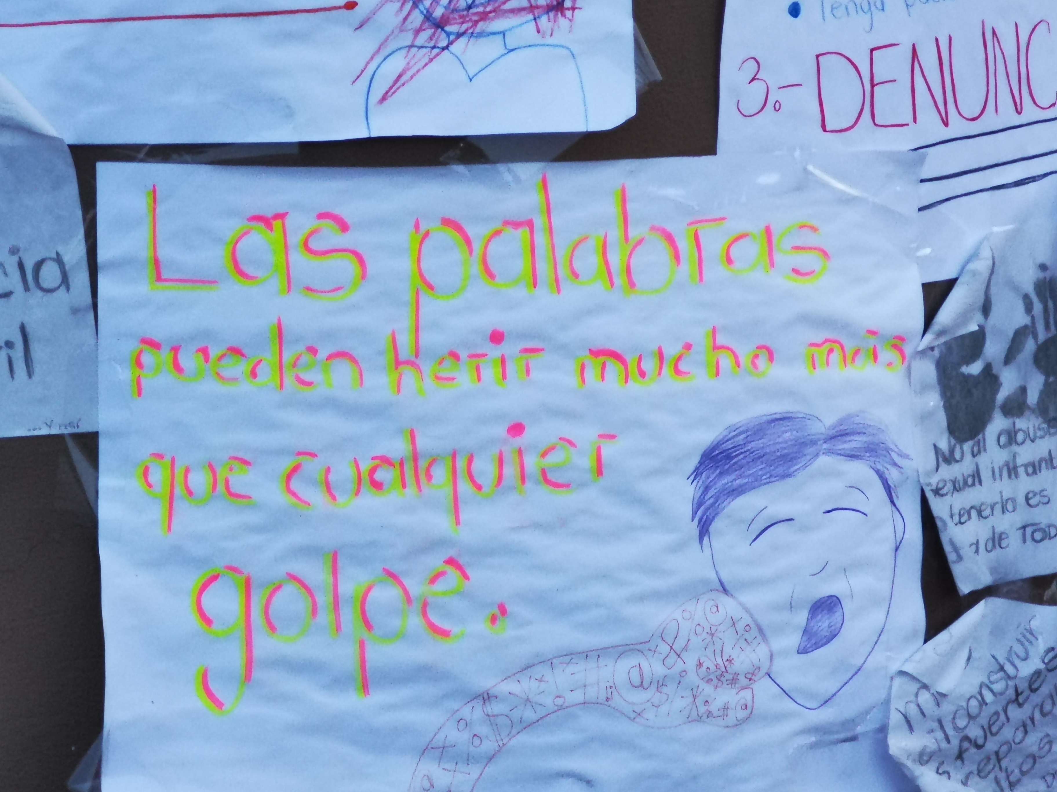 En los dibujos y mensajes plasmados se muestran a padres de familia discutiendo y un niño pidiendo ayuda, otros simulando agresiones físicas y verbales.
