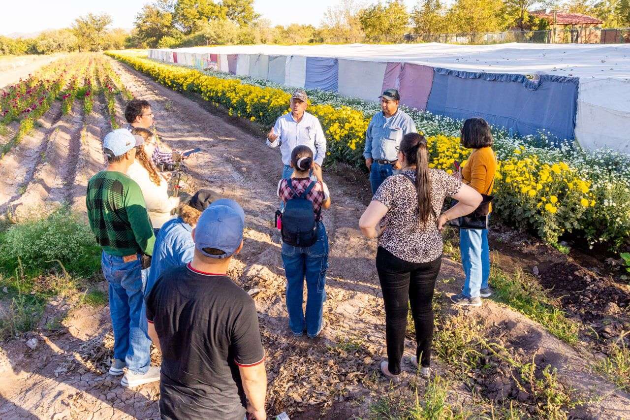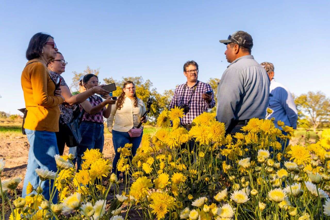 Luego de recorrer el Panteón Municipal, el grupo se dirigió a los campos de cultivo en la comunidad de Las Puentes, donde comerciantes locales plantan variedades de crisantemos, cempasúchil, girasoles, entre otros.