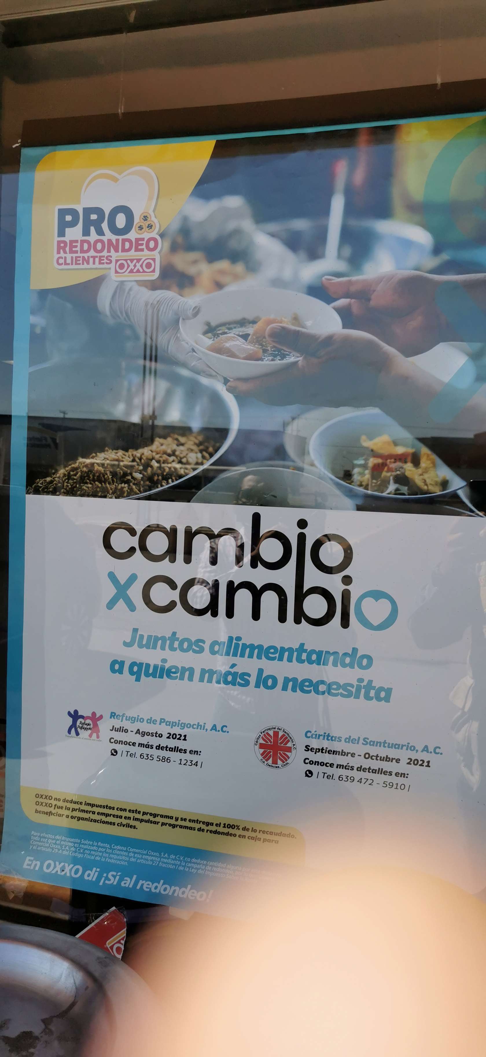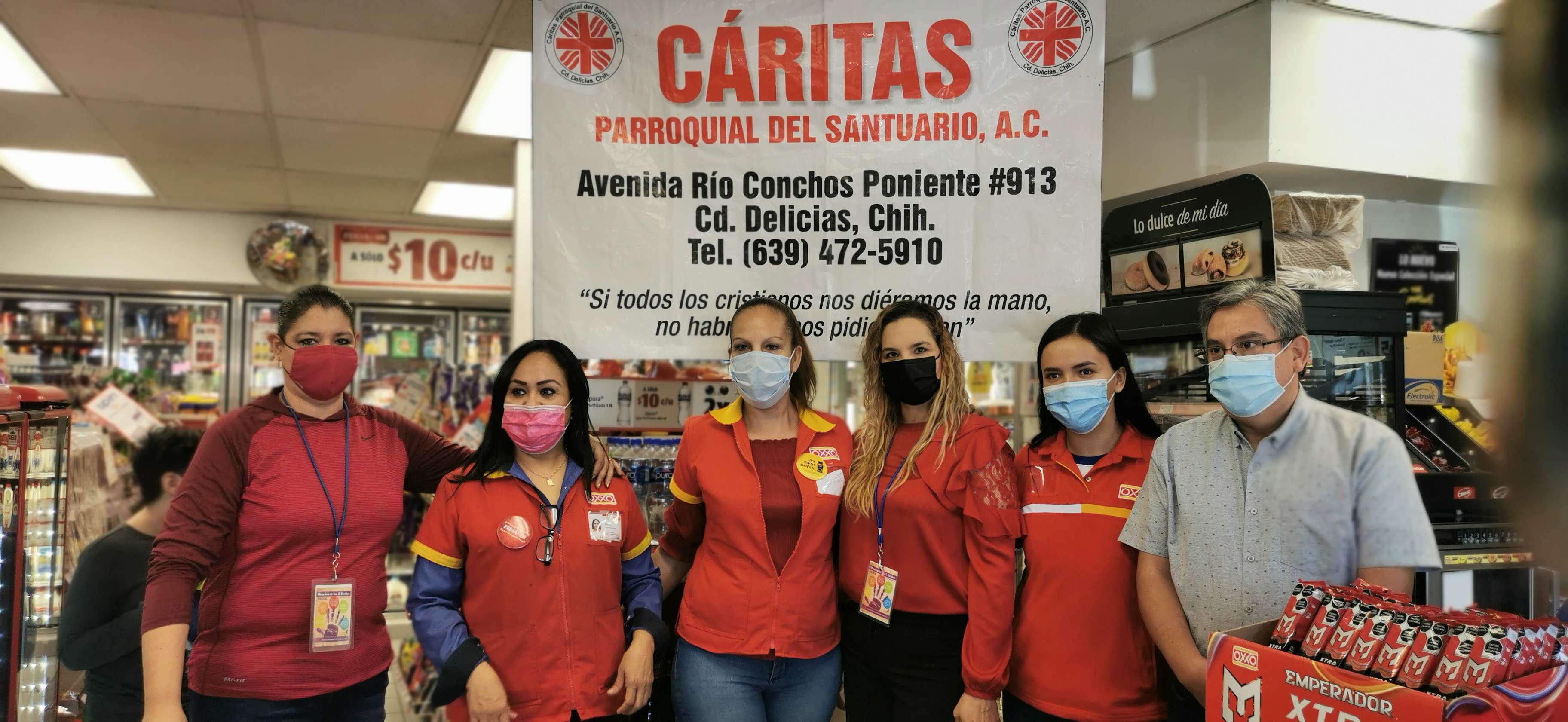 Delicias.- Bajo el lema "Cambio x cambio, juntos alimentando a quien más lo necesita" es como la sucursal "oxxo libramiento" anunció que el redondeo de lo que queda de este mes será para apoyar a Cáritas del Santuario para que puedan invertirlo en su comedor comunitario.