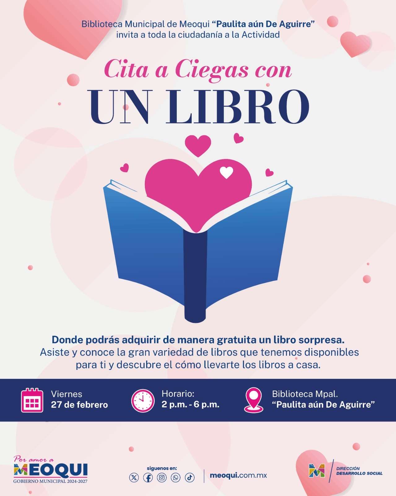 Meoqui.- En el marco del Mes del Amor y la Amistad, el Gobierno Municipal de Meoqui, a través de la Dirección de Desarrollo Social, invita a la ciudadanía a participar en la actividad “Cita a Ciegas con un Libro”, en donde podrán obtener un libro de manera gratuita, que se llevará a cabo en la Biblioteca Municipal “Paulita Aún de Aguirre”, este viernes 27 de febrero, en un horario de 2:00 p.m. a 6:00 p.m.
