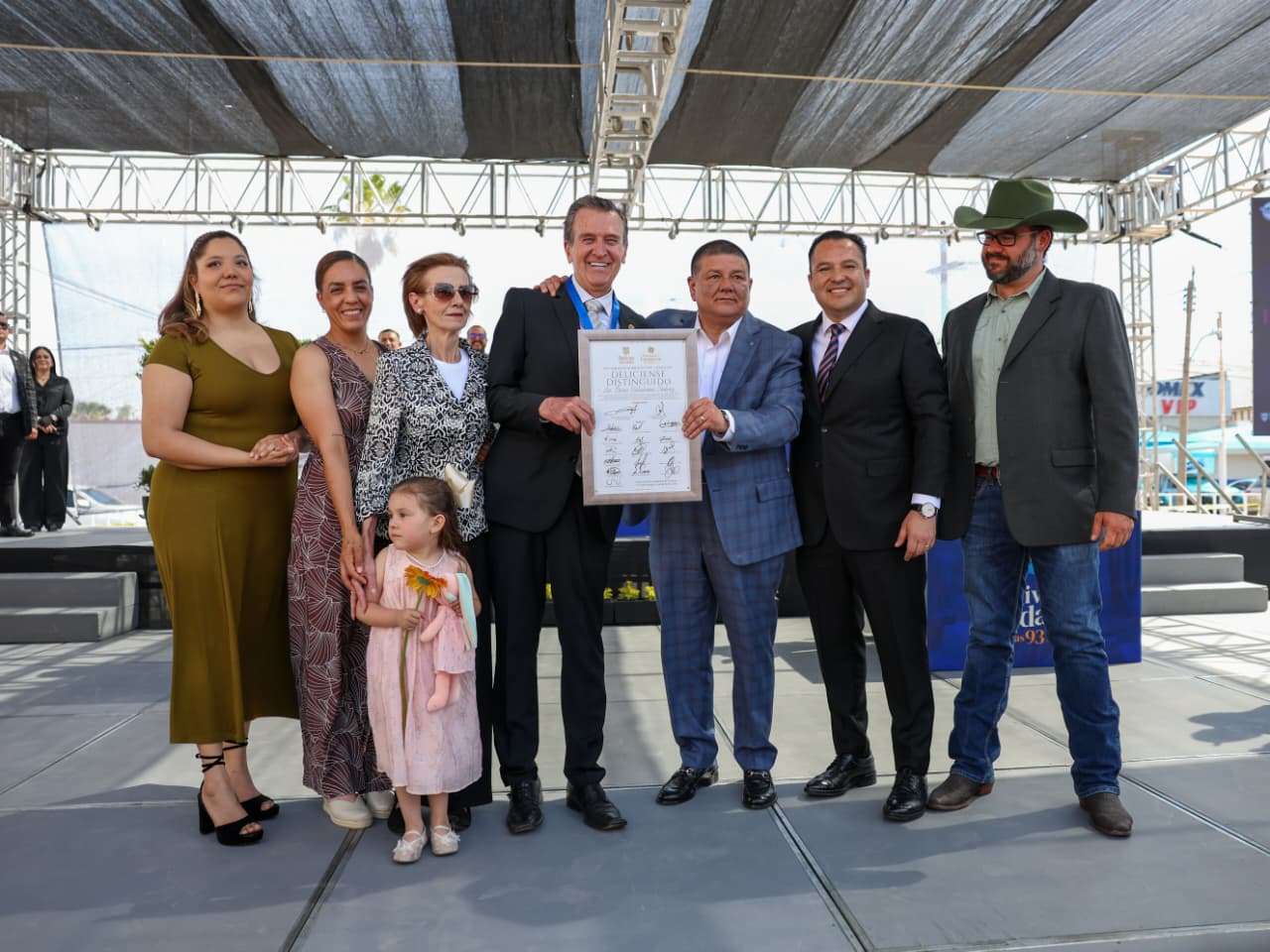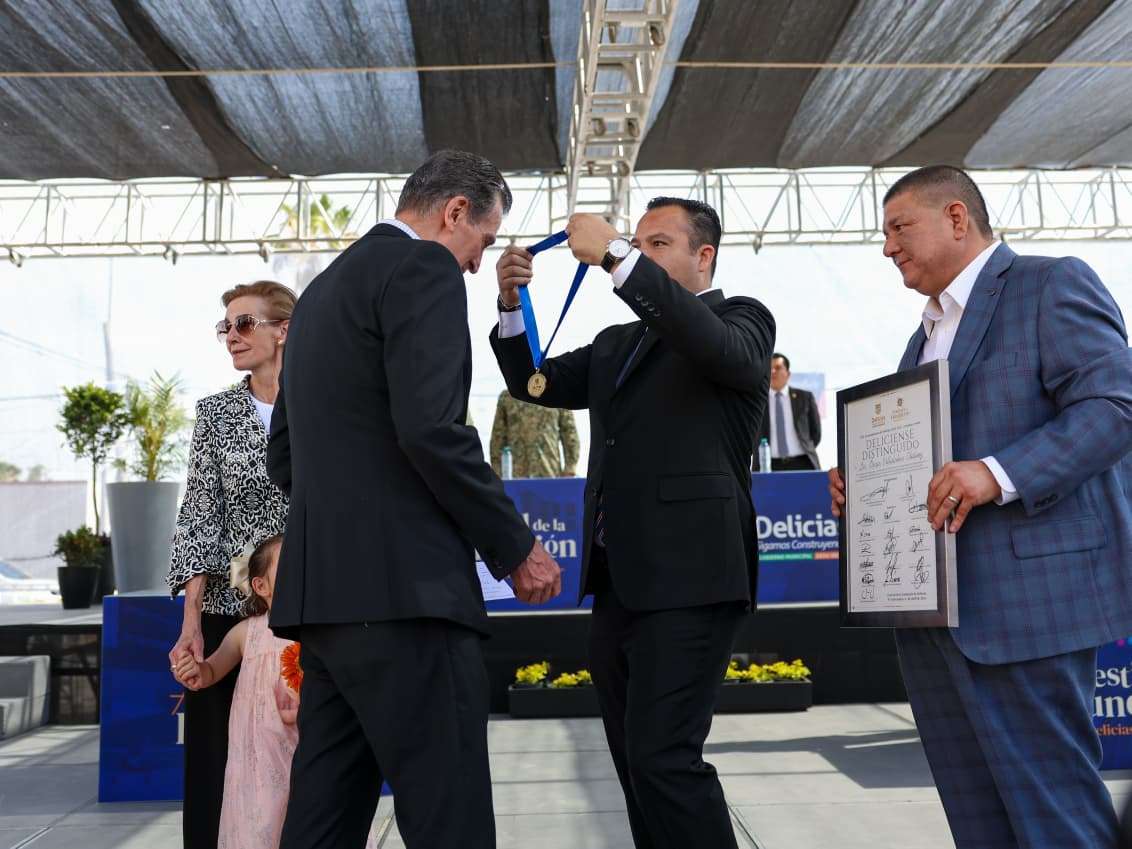 Delicias, Chih.- En el punto donde inició el trazo original de la ciudad se llevó a cabo el evento cívico con motivo del 93 aniversario de Delicias, ceremonia encabezada por el presidente municipal Jesús Valenciano García y el fiscal general del estado César Jáuregui Moreno, quienes entregaron la Medalla al Mérito Ciudadano Fundadores 2026 al Óscar Villalobos Chávez por su trayectoria y aportaciones a la comunidad.