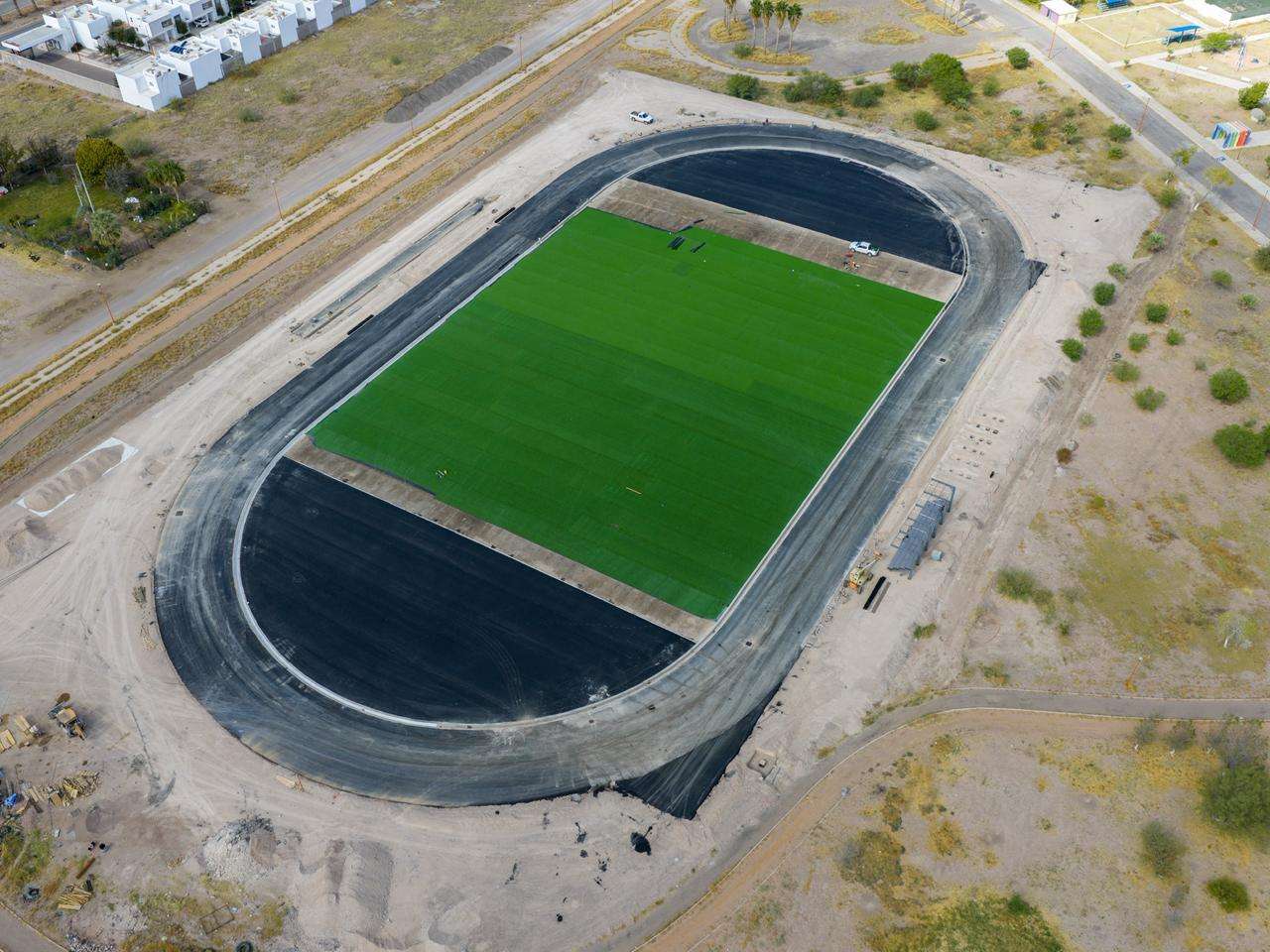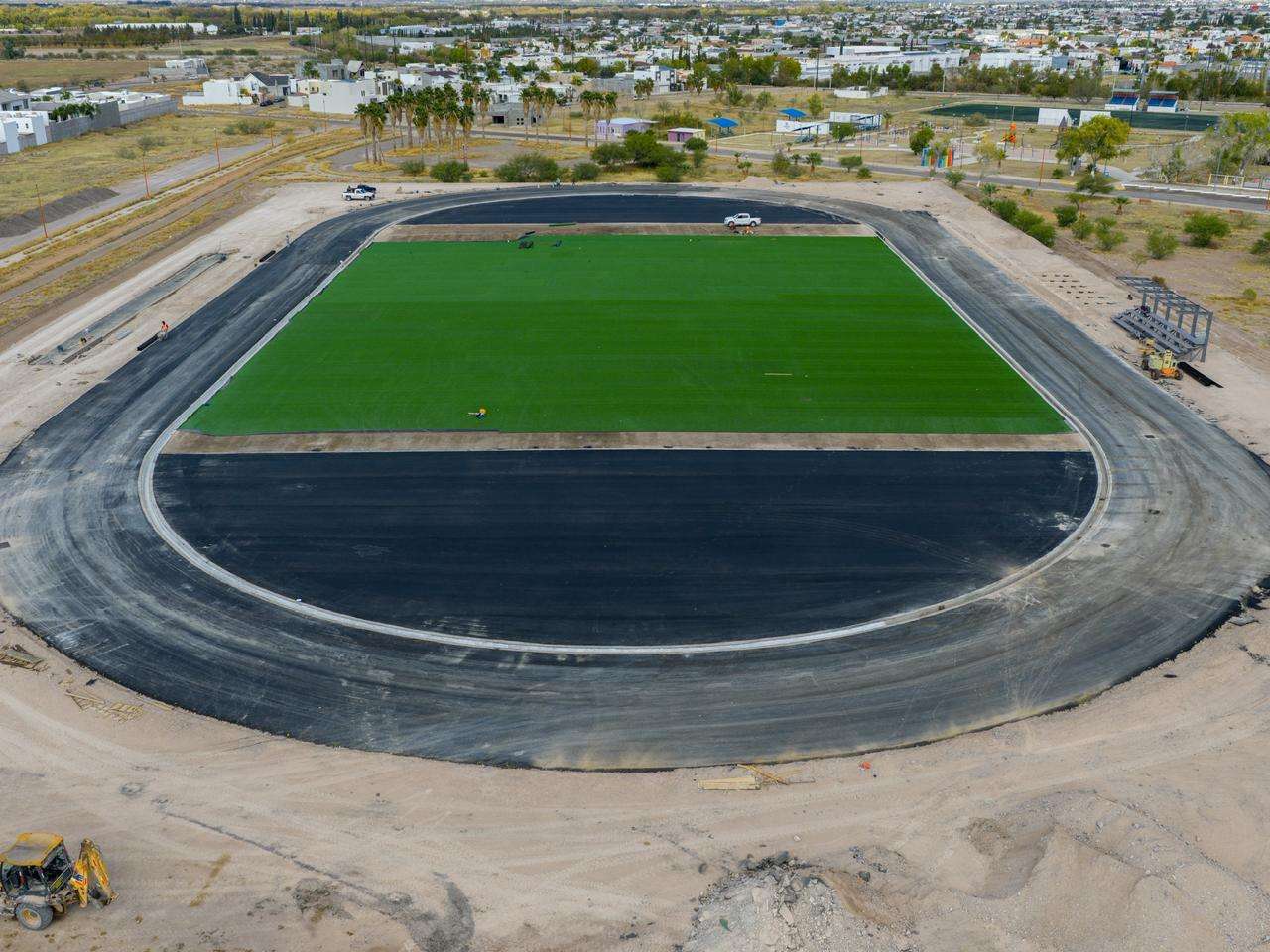 Delicias, Chih. - La pista de atletismo del municipio de Delicias registra un avance considerable con la aplicación de carpeta asfáltica en todo el óvalo y la colocación de pasto sintético en el campo de fútbol.