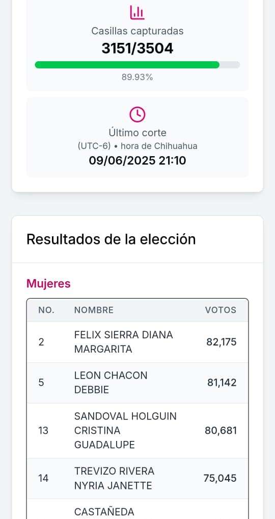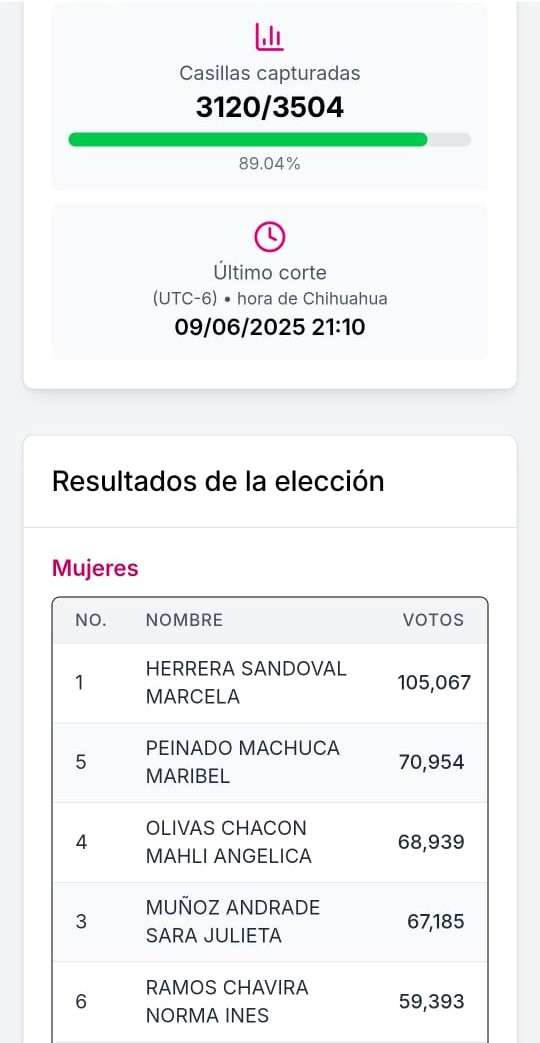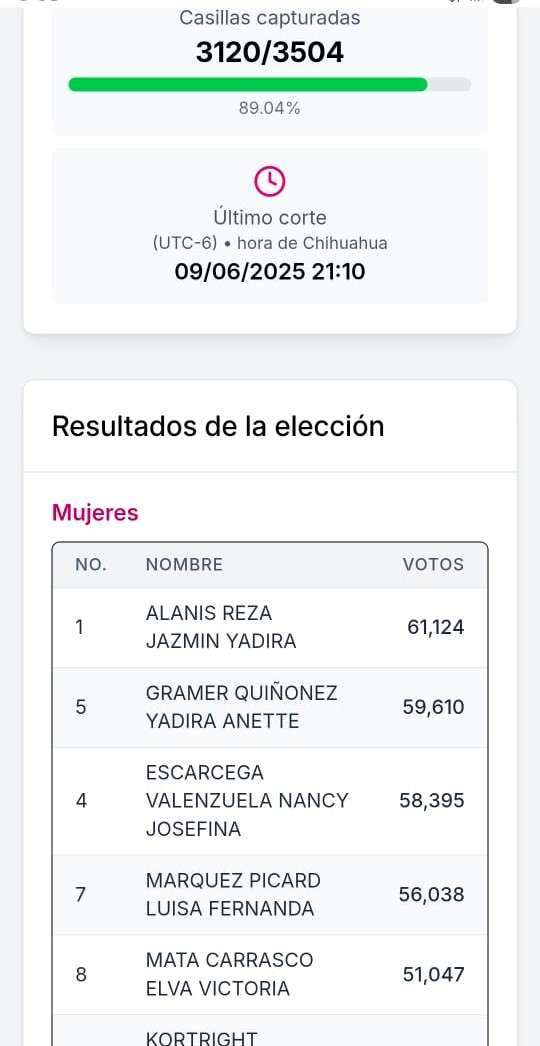 En el caso del Tribunal de Disciplina Judicial, se han contabilizado 3,120 casillas de un total de 3,504, lo que representa un avance del 89.04%. Al frente se encuentra Yadira Jazmín Reza Alanís, con 61,124 votos, seguida por Annette Yadira Gramer Quiñones, quien suma 59,610 votos.