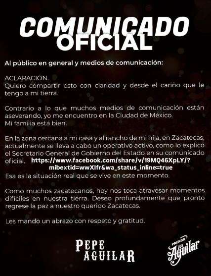 A través de un comunicado oficial, el artista afirmó que se encontraba en la Ciudad de México y que su familia se encontraba a salvo.