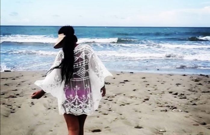 En su cuenta de Instagram, la también activista contra la discriminación racial aparece de espaldas caminando hacia el mar, usando un pareo transparente color blanco que permite ver su bikini rosa de dos piezas.