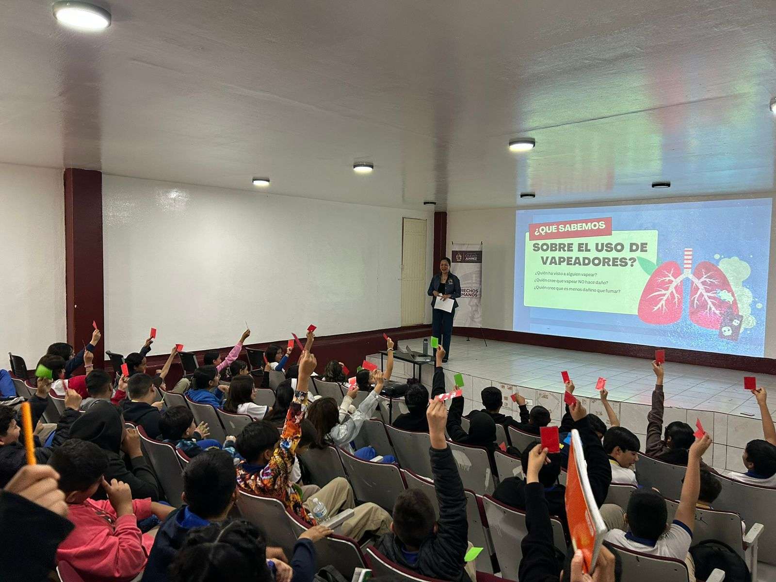 Ciudad Juárez.- El área de capacitación de la Dirección de Derechos Humanos acudió a la Escuela Secundaria Federal número 4, con el objetivo de compartir con el alumnado de ambos turnos la plática “Riesgos del uso de vapeadores en la adolescencia”.