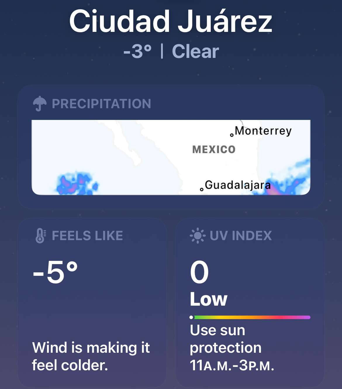 Ciudad Juárez.— Este domingo 18 de enero, Ciudad Juárez registra un amanecer frío, con una temperatura de -3 grados centígrados, cielo despejado y una sensación térmica de hasta -5 grados, debido a la presencia de viento ligero.