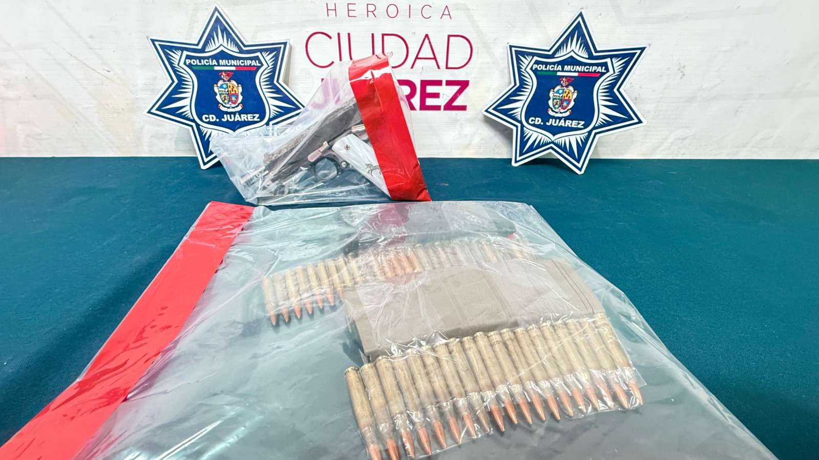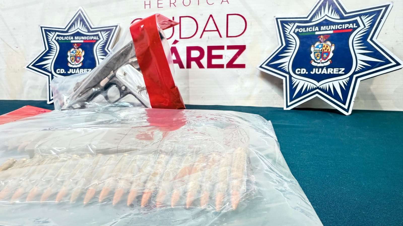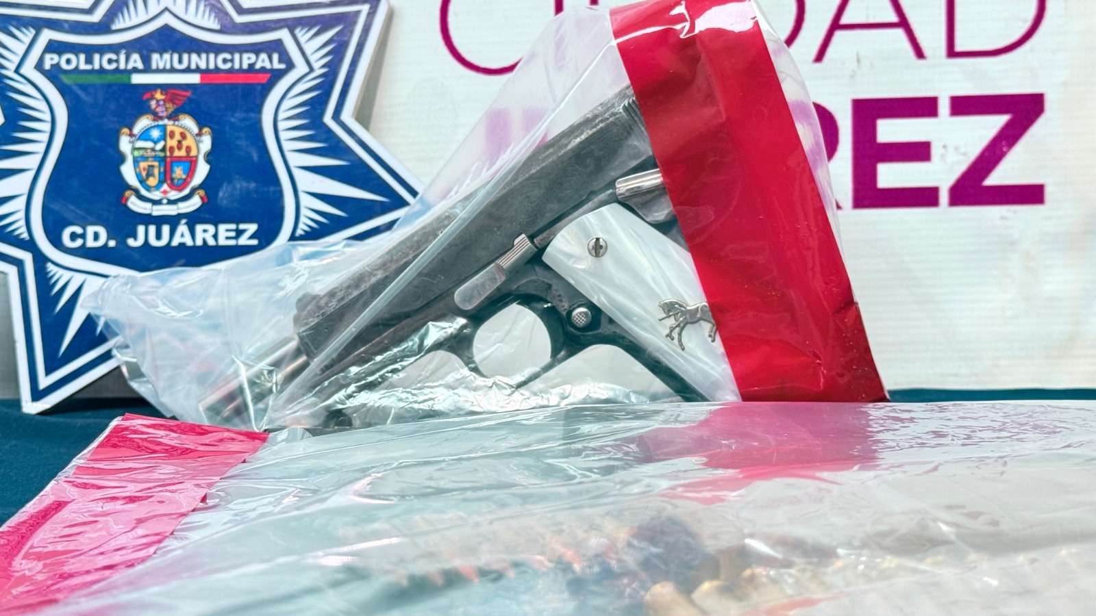 Ciudad Juárez .- Agentes de la Secretaría de Seguridad Pública Municipal capturaron a Adrián R., por su presunta responsabilidad en la comisión de delitos contra la ley federal de armas de fuego y explosivos y amenazas, asegurándole un arma corta y varios cartuchos útiles para fusil de asalto.
