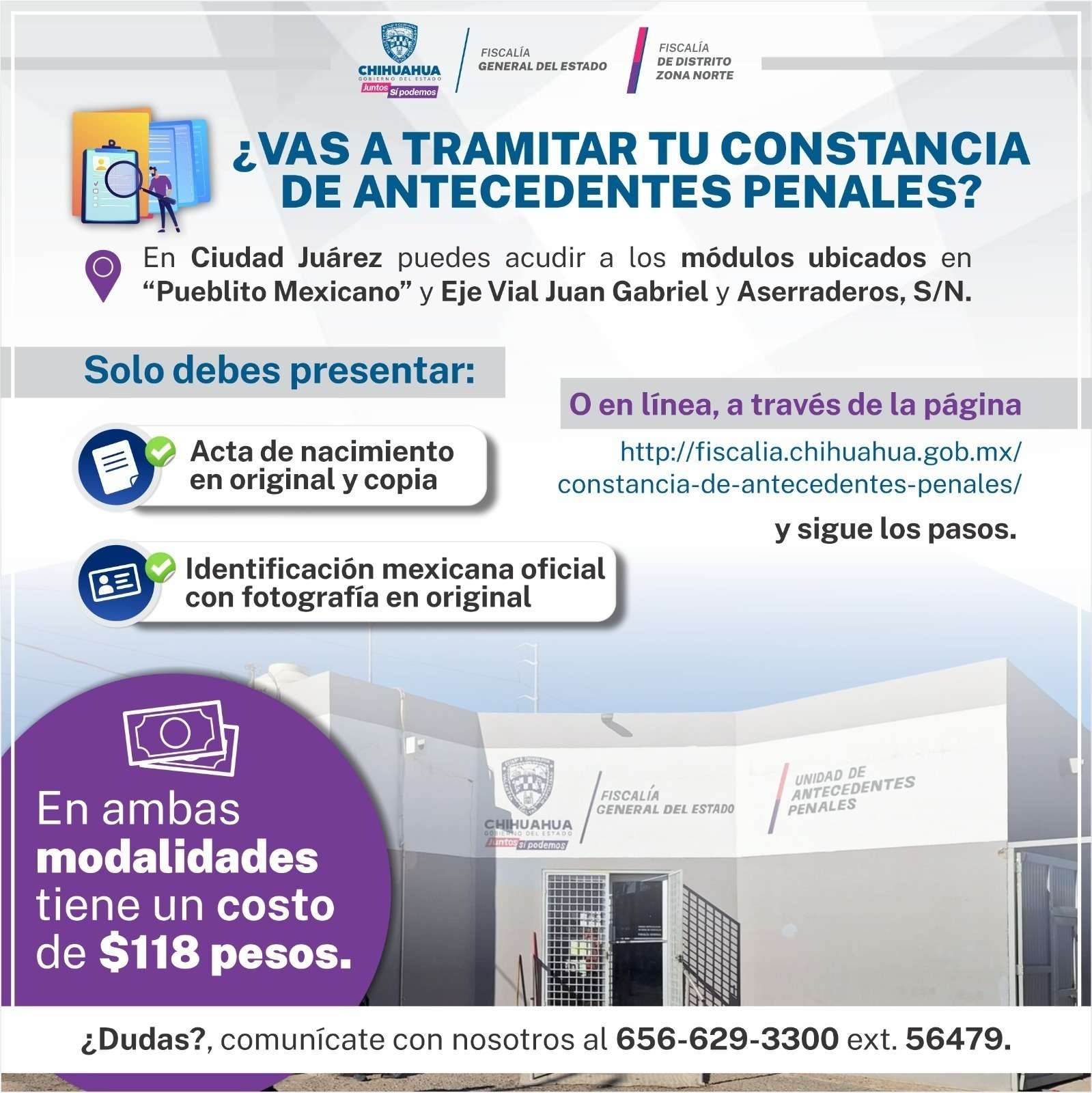 La primera opción es vía internet, en http://fiscalia.chihuahua.gob.mx/constancia-de-antecedentes-penales/, donde, desde un dispositivo con cámara, se indicarán los pasos a seguir para tramitarla.