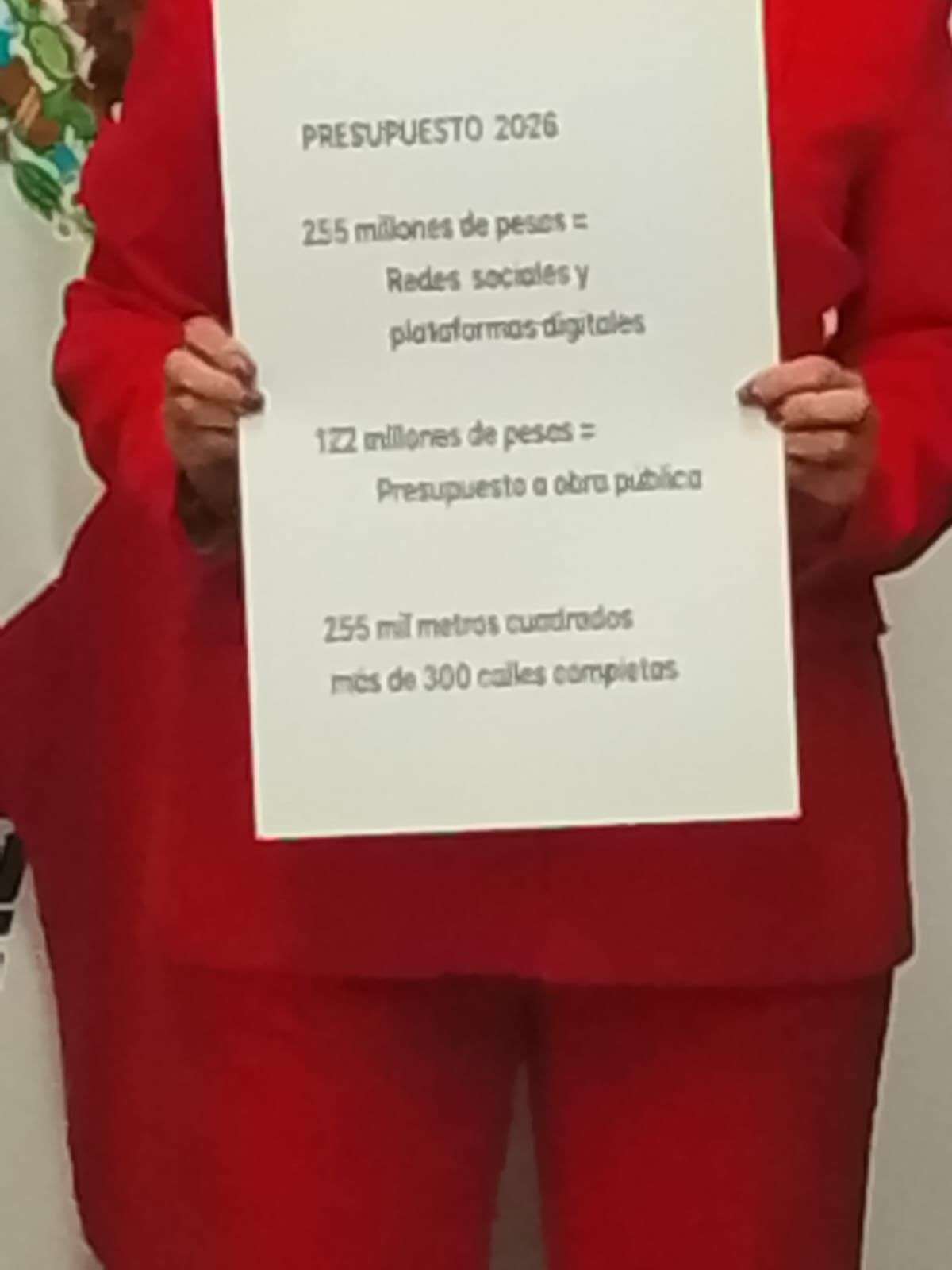 Contreras criticó el manejo del presupuesto municipal y cuestionó la prioridad otorgada al gasto en imagen personal del alcalde, al afirmar que para el ejercicio 2026 se destinaron alrededor de 255 millones de pesos a publicidad, frente a una inversión de 122 millones de pesos en obra pública. Sostuvo que, con esos recursos, se podrían haber pavimentado más de 300 calles en distintos sectores de la ciudad.