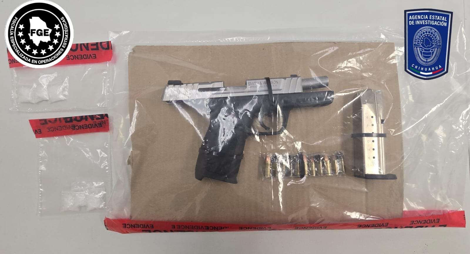 Ciudad Juárez.- Oficiales de la Agencia Estatal de Investigación (AEI) adscritos a la Unidad de Investigación contra el Narcomenudeo, detuvieron en flagrancia a dos hombres por delitos contra la salud y portación de Armas de Uso Exclusivo.