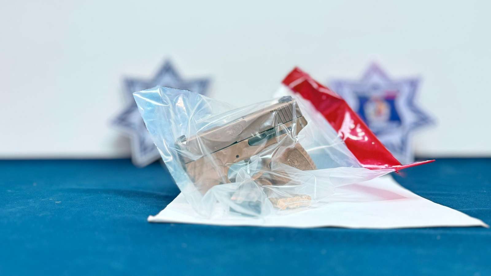 Ante esta situación, se le marcó el alto al conductor por protocolos de seguridad en el cruce de las calles Soneto 154 y Felipe Guele, en donde los tripulantes fueron sometidos a una inspección preventiva, en la cual se les localizó un arma de fuego color café en el portavasos del vehículo.